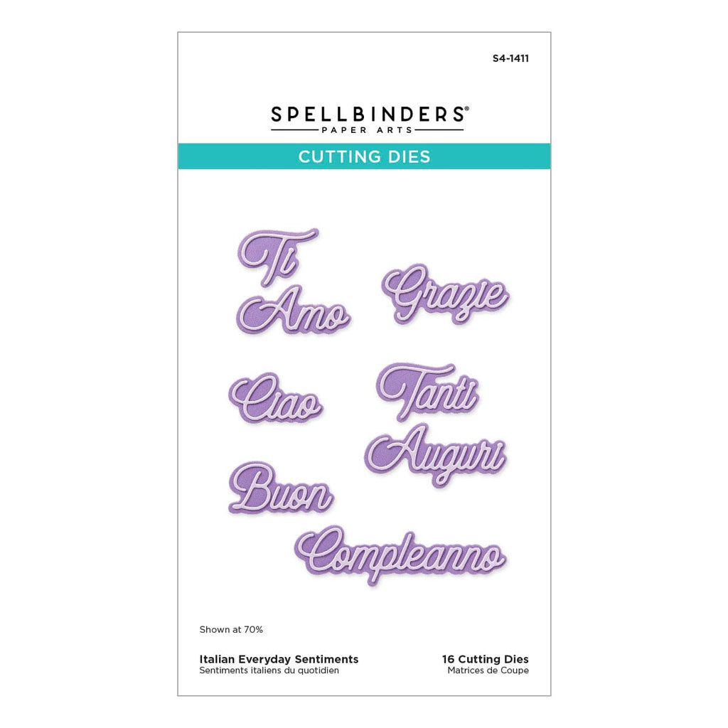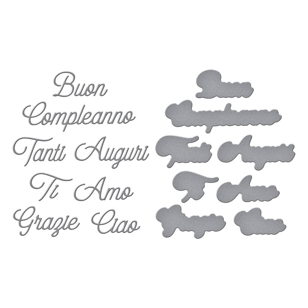 Italian Everyday Sentiments Etched Dies are from the International Sentiments Collection. Many Italian phrases can be created in this set of 16 thin metal cutting dies. The fancy script font can be used in a narrow font or make it bolder by adding its matching shadow die. To expand your sentiment even more, try BP-265 Italian Sentiments Press Plate & Die Set to letterpress or foil for an impressive impression! Words include Compleanno/Birthday, Ti/You, Amo/I Love, Tanti/Many, Auguri/Congratulations, Grazie/Thank You, Ciao/Hi, and Buon/Good.