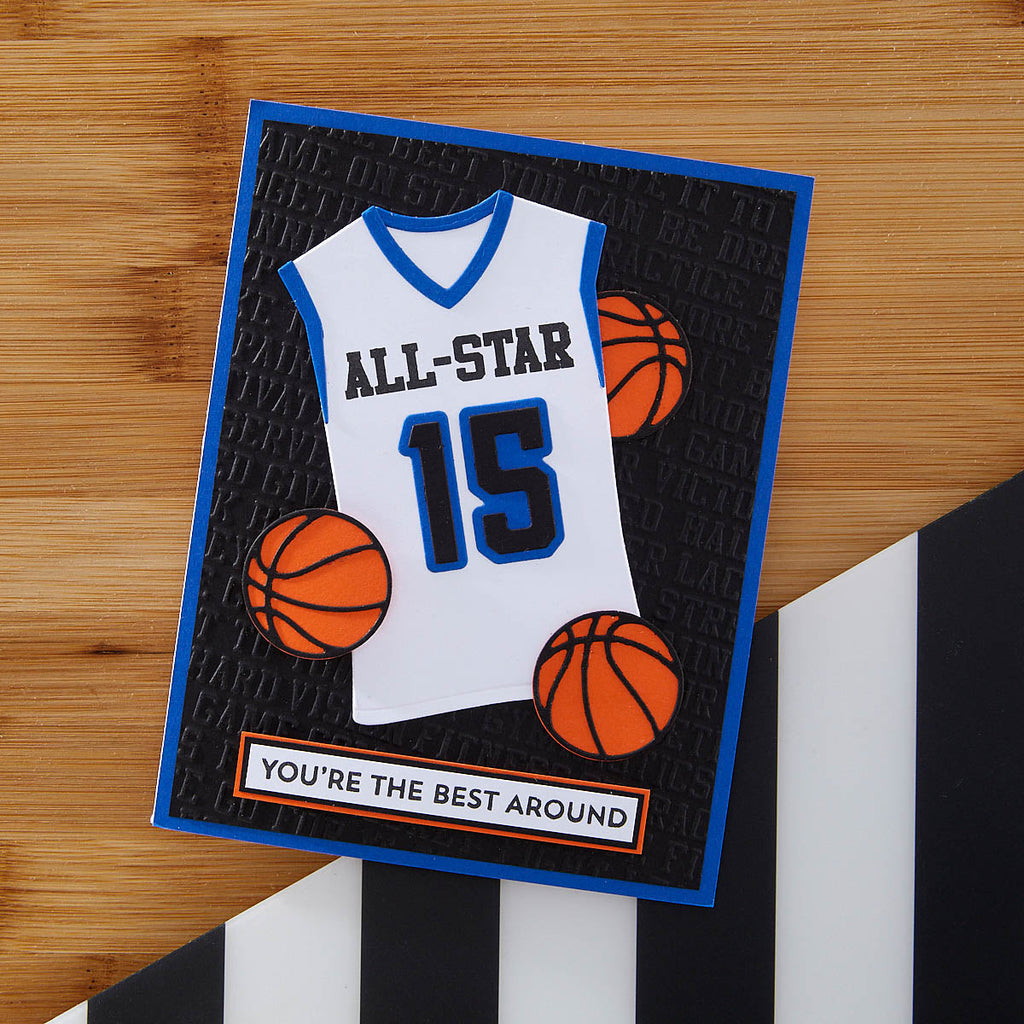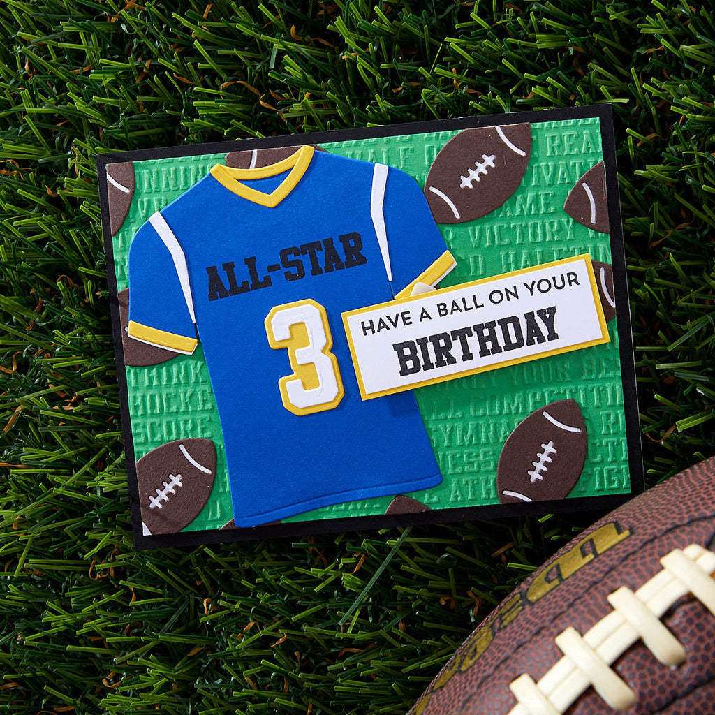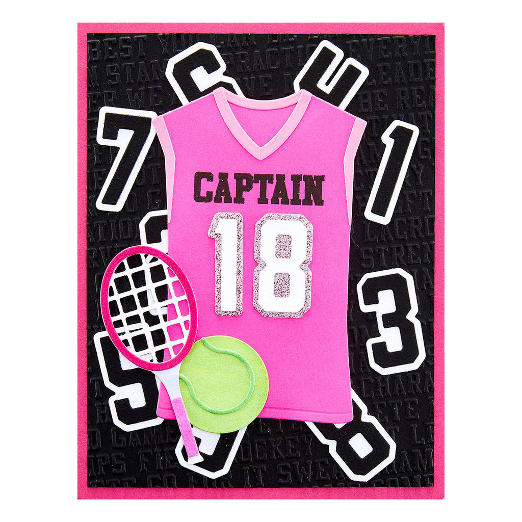 The Game Day Collection is Justine Dvorak’s first collaboration with Spellbinders. From sportswear, numbers, accessories, themed-sentiments and even an embossing folder, it has it all to create and customize projects for your sports fan!