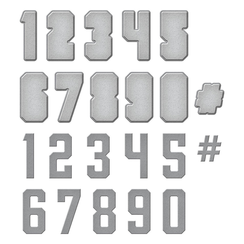 Jersey Numbers Etched Dies are from the Game Day Collection by Justine Dvorak. There are 22 thin metal cutting dies that covers all the numbers and their outlines to make them bolder. So pick out your favorite number and add to S4-1294 Athletic Apparel Die Set (sold separately) to personalize your projects.