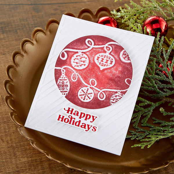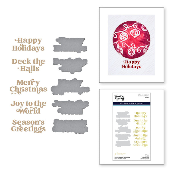 The Joyful Christmas Sentiments Glimmer Hot Foil Plate & Die Set is a part of the Joyful Christmas Collection by Simon Hurley. On one hot foil plate, five bold font holiday sentiments can be foiled all at once. Using its matching die, all the sentiments can be die-cut at the same time. Perfect for creating many holiday cards in a short amount of time!