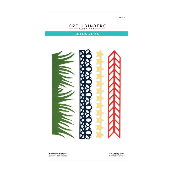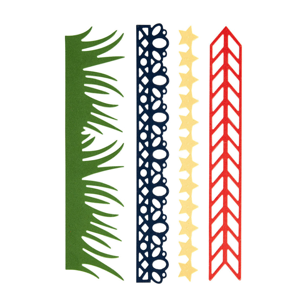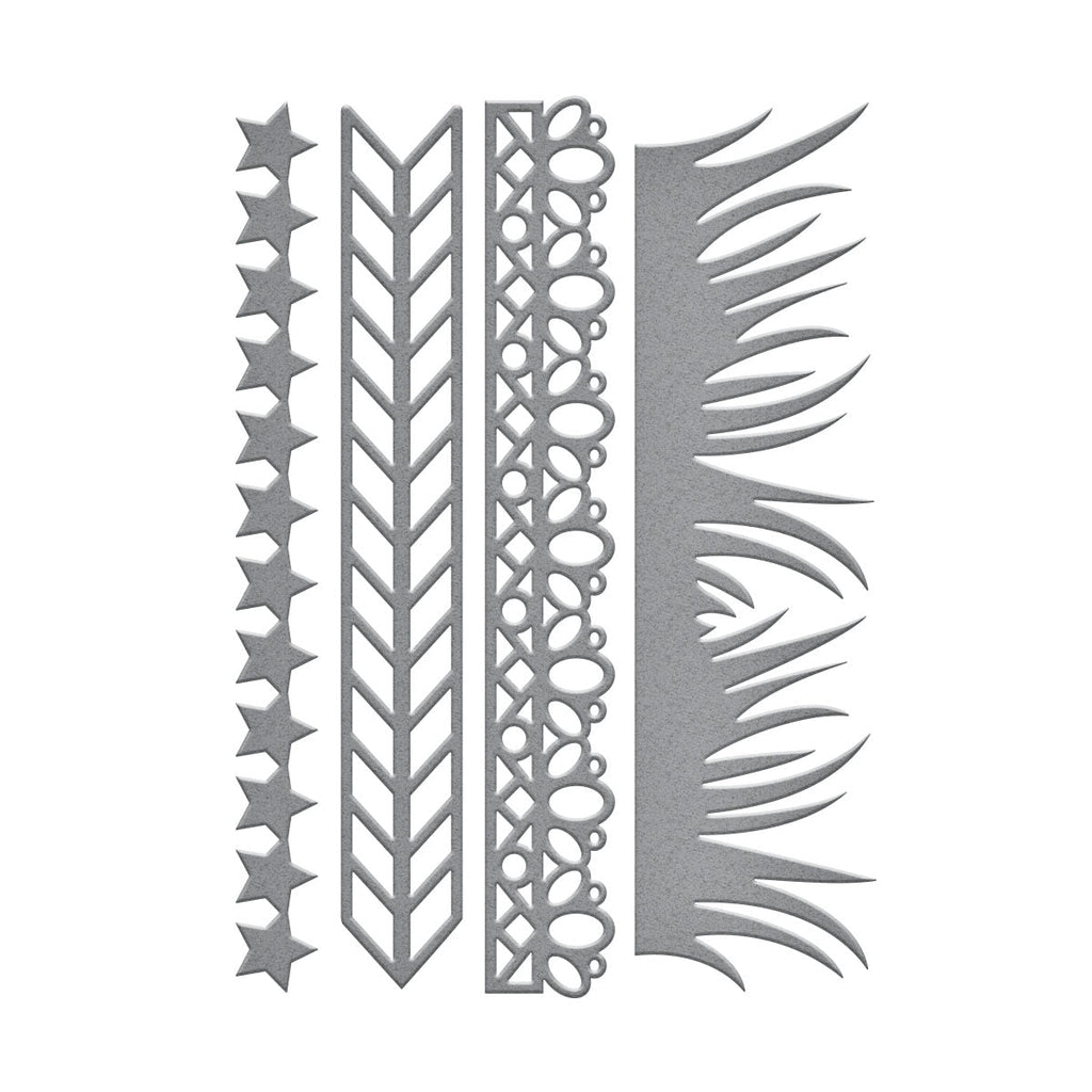 The Bunch of Borders Etched Dies is a set of four thin metal dies that create borders that can be used with many types of card sizes from slimline to A2. With a detailed, elegant lace, a classic chevron, grass and stars, use this set of borders to create a background, a border, accent designs and beyond - truly endless design possibilities!