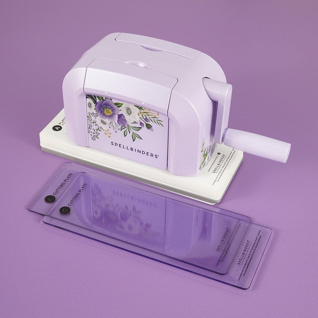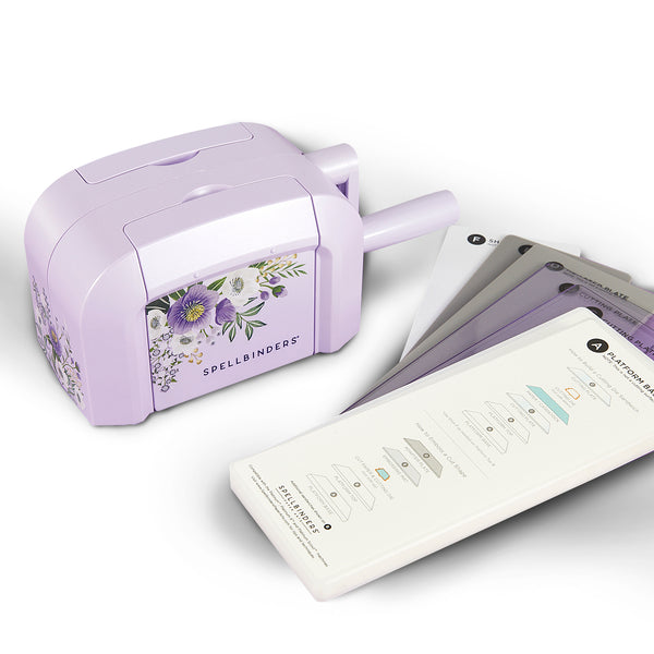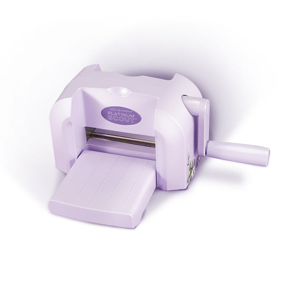 Exclusive Lilac Shimmer Platinum Scout Die Cutting & Embossing Machine - 3.5" Platform. The Lilac Shimmer Platinum Scout joins the family of Spellbinders award-winning Platinum Series Die Cutting and Embossing machines in a new, smaller size. This mini machine has maximum power in a compact size. The gorgeous Lilac Shimmer Editions feature a shimmering lilac finish, custom artwork, lilac cutting plates, and a matching dies set & embossing folder.