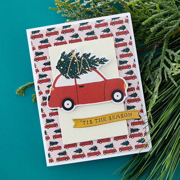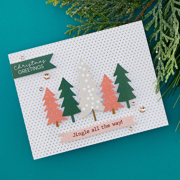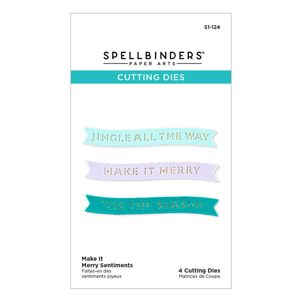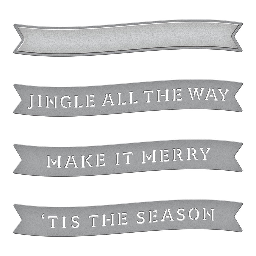 Make It Merry Sentiments Etched Dies are part of Make It Merry Christmas. The set of four thin metal cutting dies includes a banner die with three interchangeable sentiment inserts to choose from. Nest the banner die and one of the inserts to create a wonderful sentiment cut into the banner. Sentiments include Jingle All the Way, Make It Merry, and ‘Tis The Season.