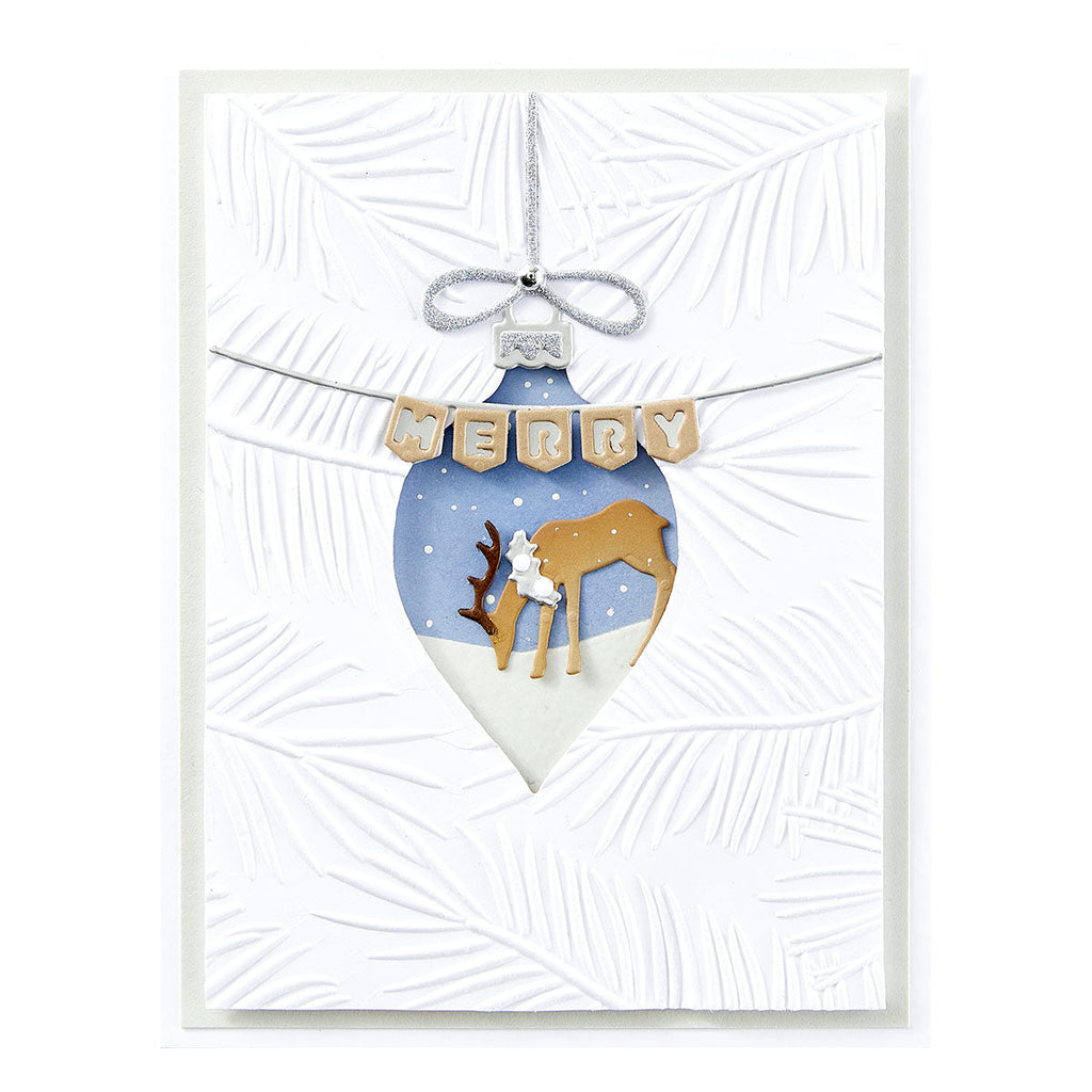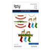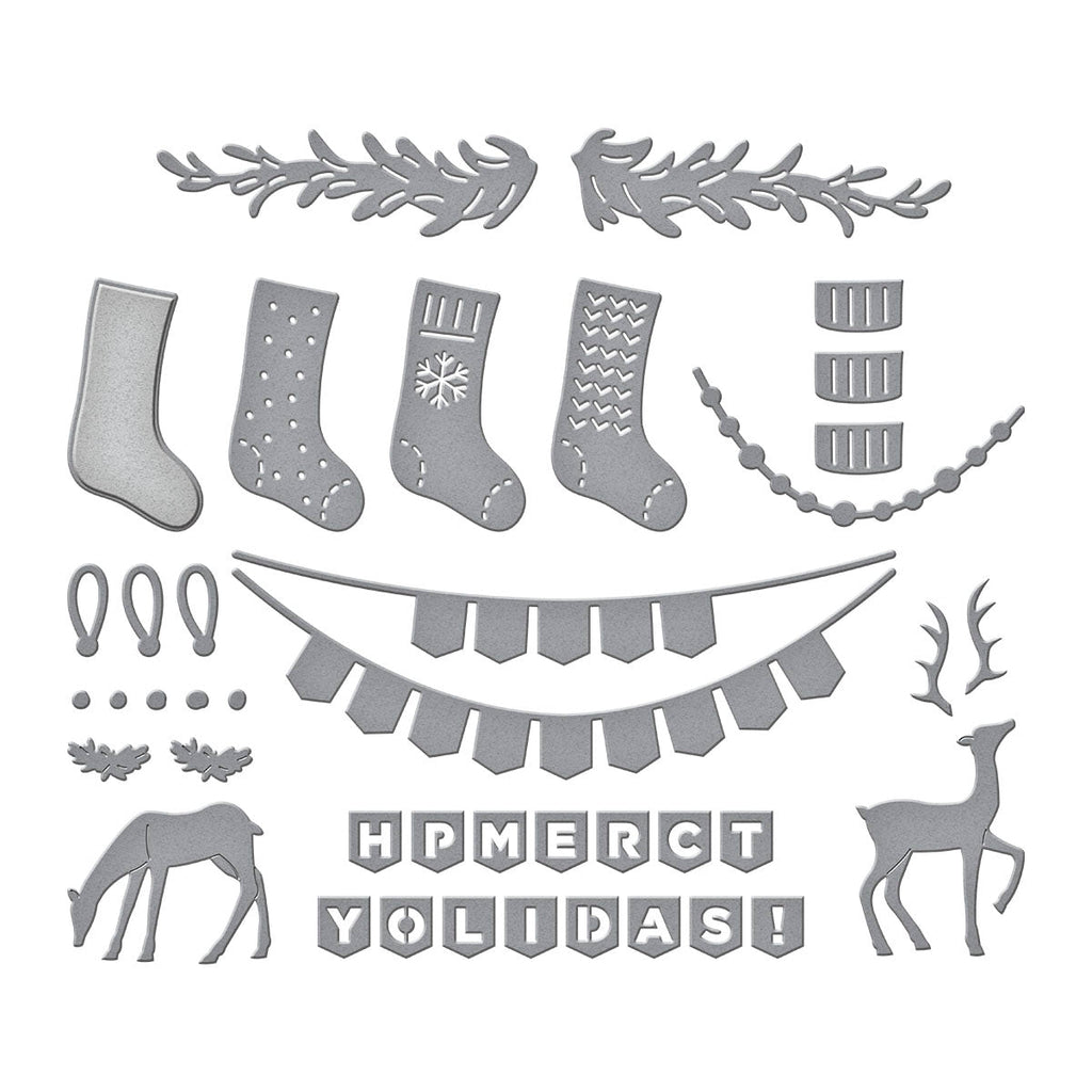 Mantel Decoration Etched Dies are from the Timeless Trees Collection by Simon Hurley. Add these holiday-themed accents to any seasonal project. The set of 15 thin metal cutting dies includes two deer designs and their accessories, three stocking designs with their accessories, two garland designs and their layers, and a two-banner base with its letters to spell out holiday greetings. It is designed to work with S4-1395 Mantel Village to create a festive village scene.