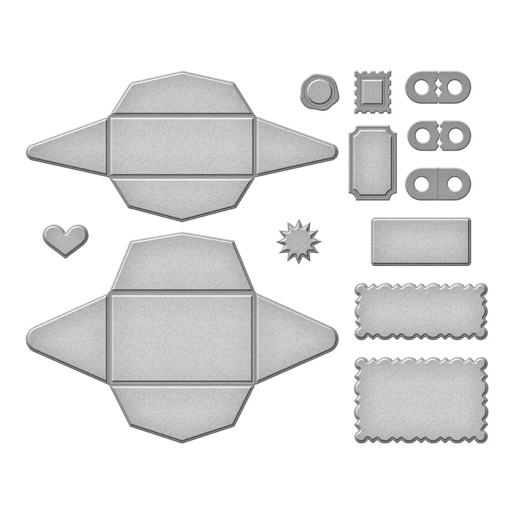 Mini Envelopes 2 Etched Dies are from the Flea Market Finds Collection by Cathe Holden. It has a set of 12 thin cutting metal dies that create two different sizes of mini envelope. Each size has a matching stationery insert to slide inside the envelope. The larger envelope has a rectangle window to cut the front. There are nine elements to use with both envelopes: wax seal, tag, heart, starburst seal, postage stamp, label, and three folded reinforcement holes. The Large Envelope assembled measures 2.56 x 1.63 in./6.50 x 4.10 cm, and the Small Envelope assembled measures 2.56 x 1.06 in./6.50 x 2.70 cm.
