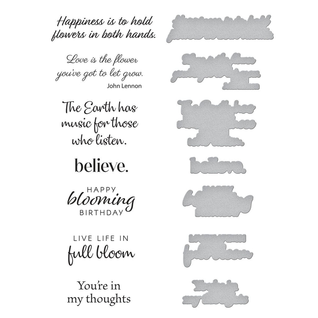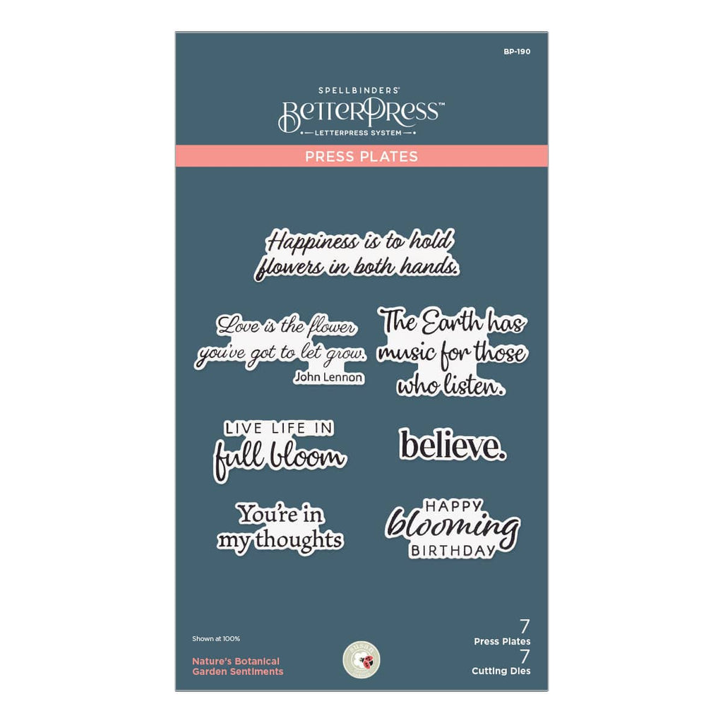 Nature's Botanical Garden Sentiments Press Plate & Die Set is a part of the Nature's Botanical Garden Collection by Susan Tierney-Cockburn. There are seven different thoughtful sentiment press plates with matching dies to cut out to highlight and lift for dimension. Sentiments include 'Happiness is to hold flowers in both hands', 'Live Life in Full Bloom', 'Happy Blooming Birthday' and more. Ink the plates with the BetterPress Ink to be pressed against the BetterPress Cotton Card Panel and Sheets for a crisp letterpress design.