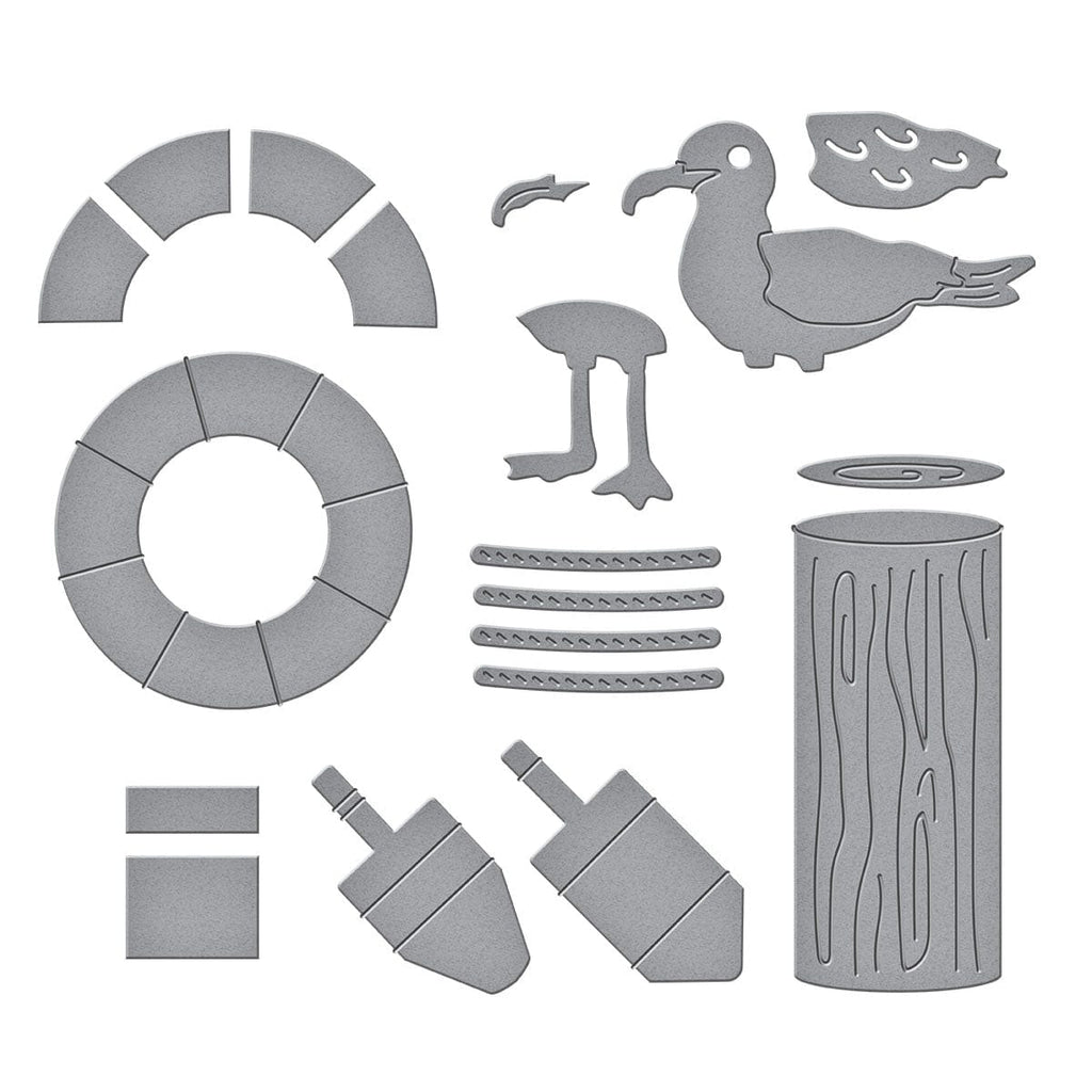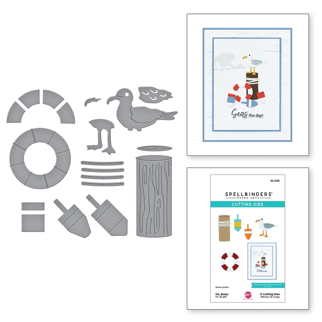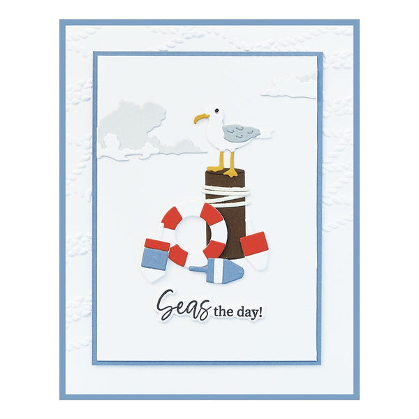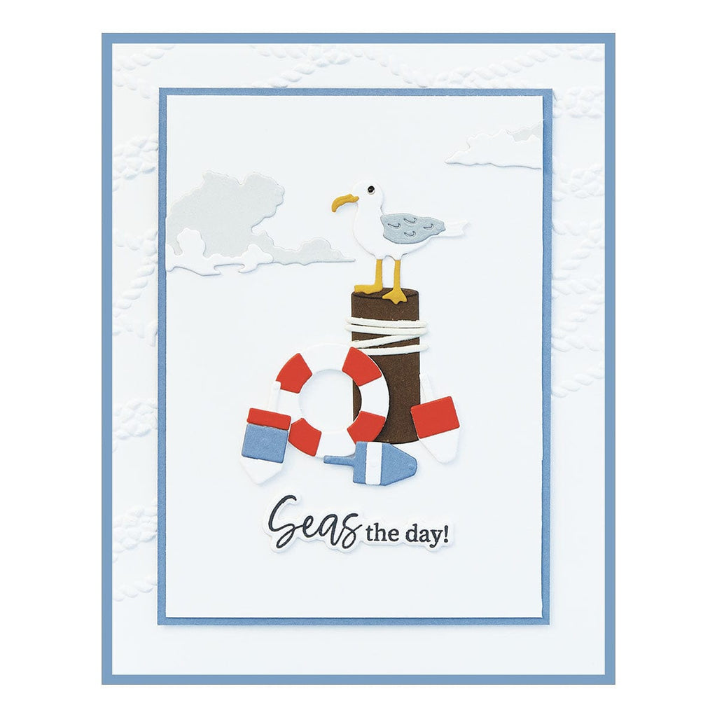 Oh, Buoy! Etched Dies are part of the Fair Winds Collection by Dawn Woleslagle. Assembled, this set of eleven thin metal cutting dies creates an adorable beach scene of a seagull perched on a wooden dock. With the addition of two different buoys as well as a life preserver, this set includes everything you need for a perfect summer backdrop. The dies for the logs and rope also emboss for additional texture and realism.