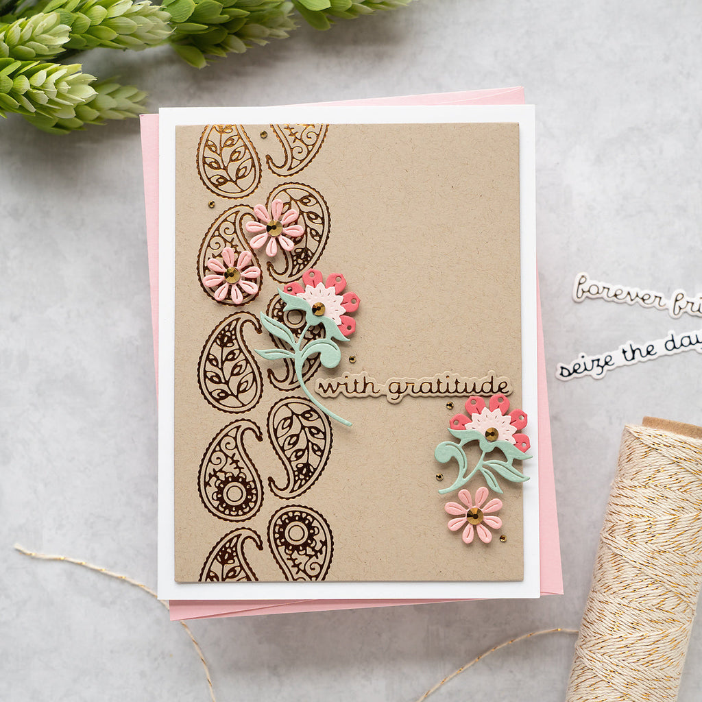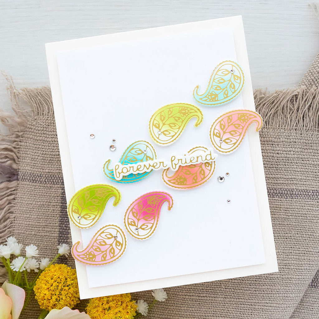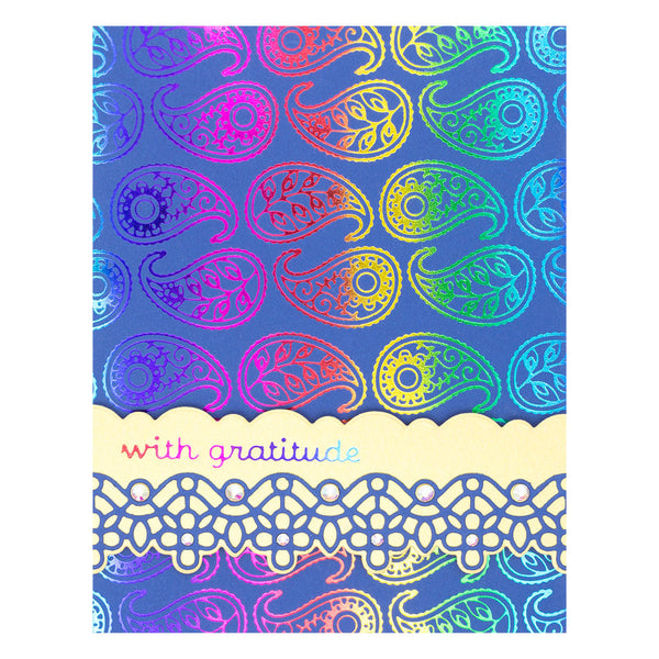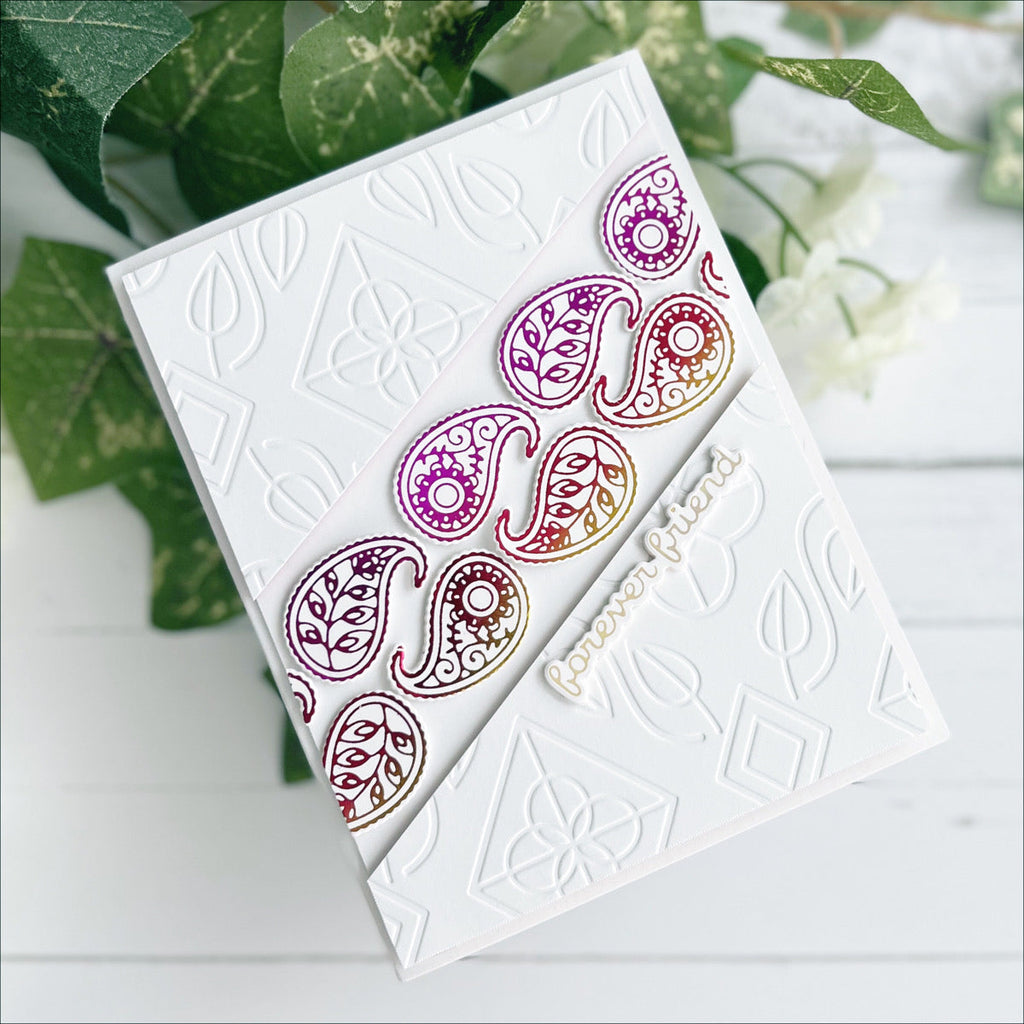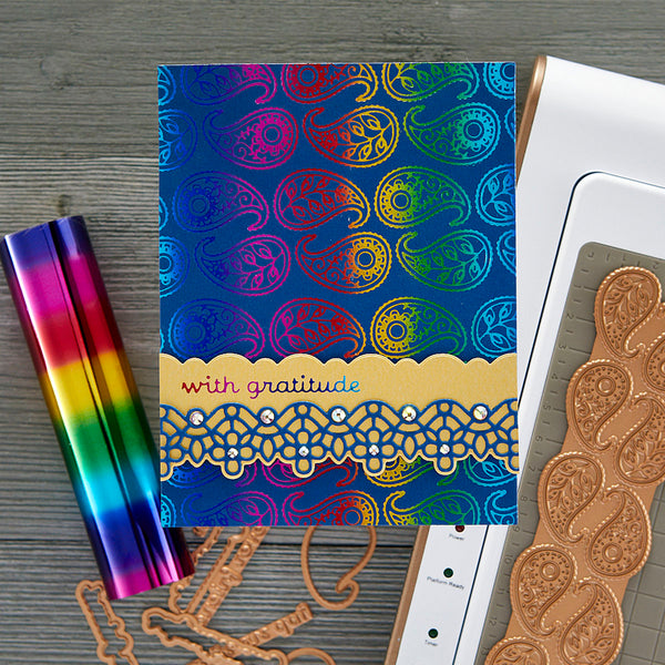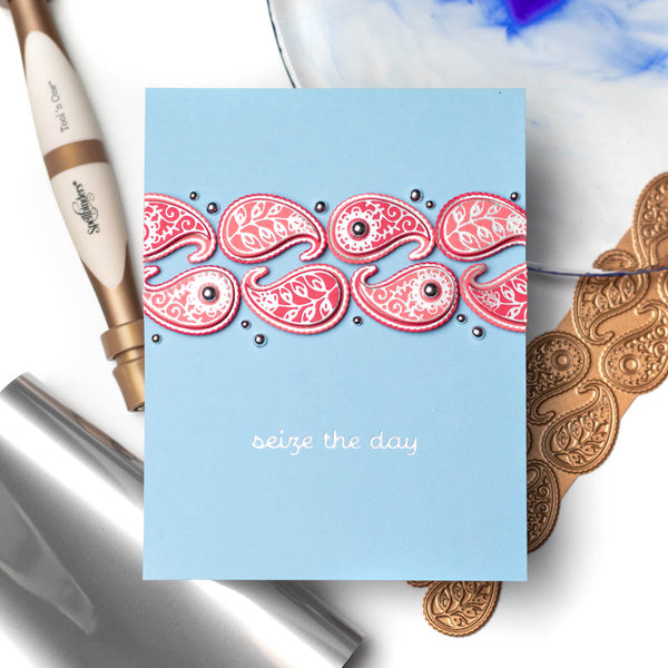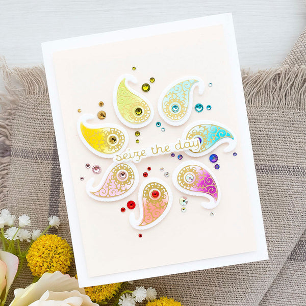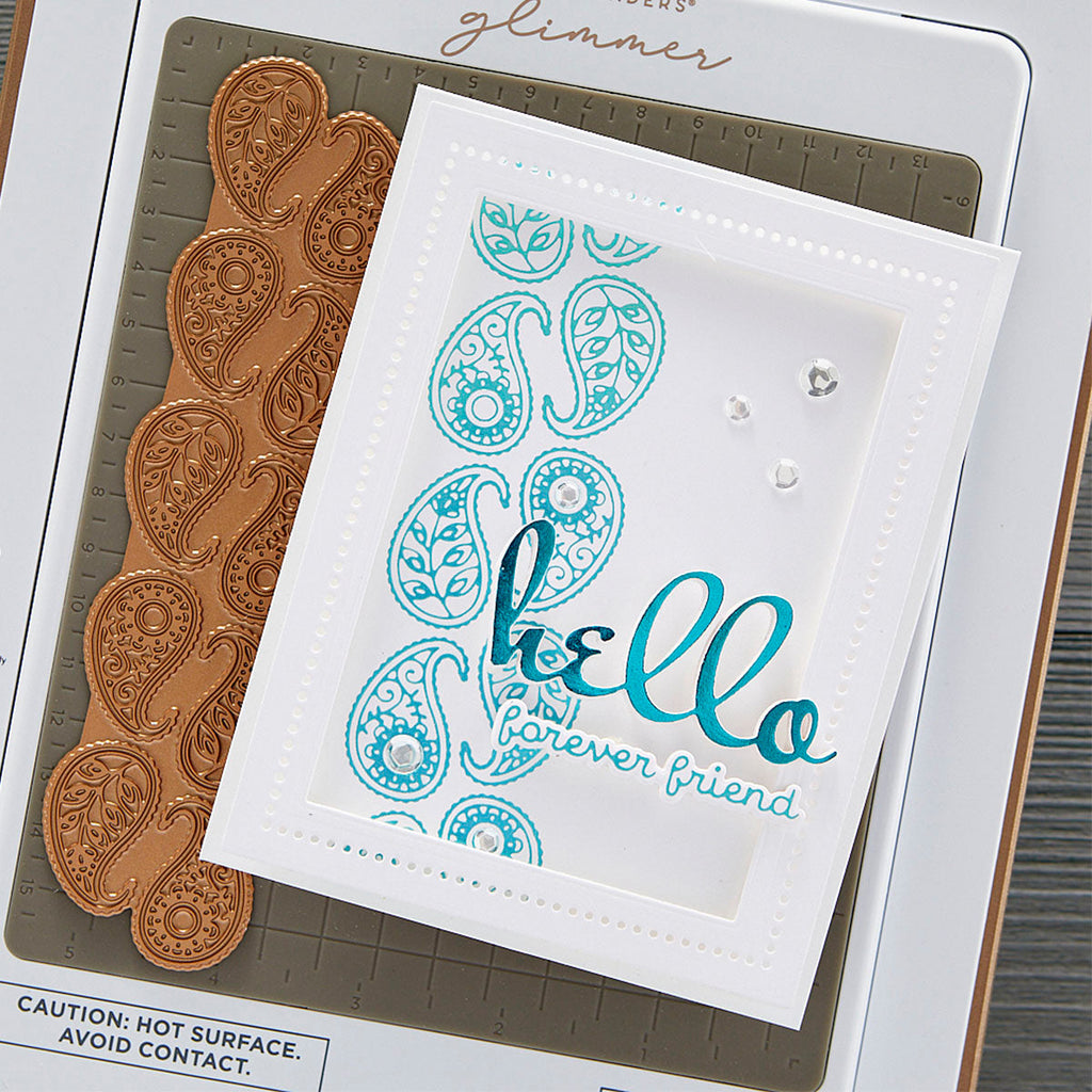 Paisley Glimmer - Glimmer Hot Foil Kit of the Month (Plates Only). This Glimmer Hot Foil Plate Set adds a stunning foiled paisley designs to cards and projects. Released June 2022 to our Glimmer Hot Foil Kit of the Month Club, it is a wonderful addition to your glimmer collection. Perfect for creating spring, summer and greeting cards, Décor, gifts, and more! Glimmer Hot Foil Plates are designed to be used with the Spellbinders Glimmer Hot Foil System (or other compatible hot foil system). Depending on its design, some plates June be used for letterpress and embossing.