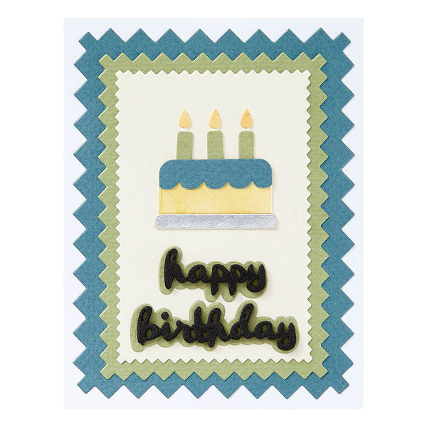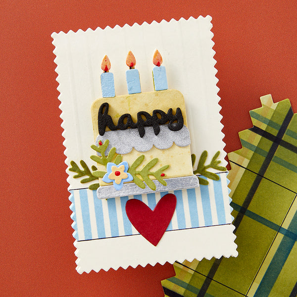 Pinking Edge Birthday Add-Ons Etched Dies are part of the Not Your Ordinary Card Collection by Wendy Vecchi with a set of twelve thin metal cutting dies perfect for bring birthday cheer to your cards and projects. A set of three nesting rectangles with adorable zig-zag edges make an ideal base for the sweet birthday cake and it's yummy frosting! The set also includes a scripted 'happy birthday' sentiment complete with an outline die to really make it pop!