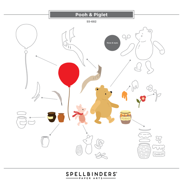 Pooh & Piglet Etched Dies are from the Say Cheese Classic Pooh Collection. This set of 19 thin metal cutting dies creates the sweet duo of Pooh and his friend, Piglet. It comes with other accessories that go with the duo such as a balloon, flower, honey pots, pen, and scroll. Pairs well with S4-1428 Pooh's Hunny Pot Etched Dies and S5-683 Tigger & Eeyore Etched Dies.