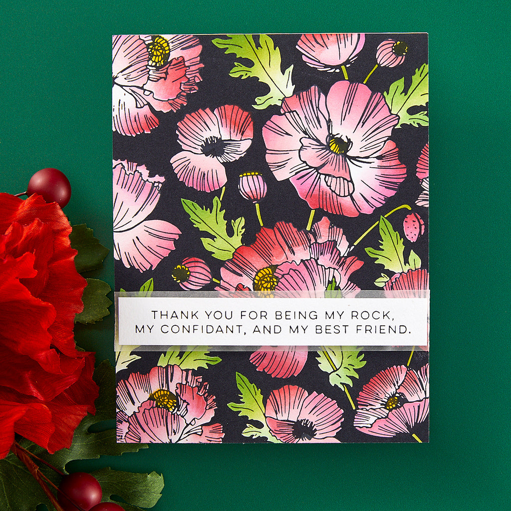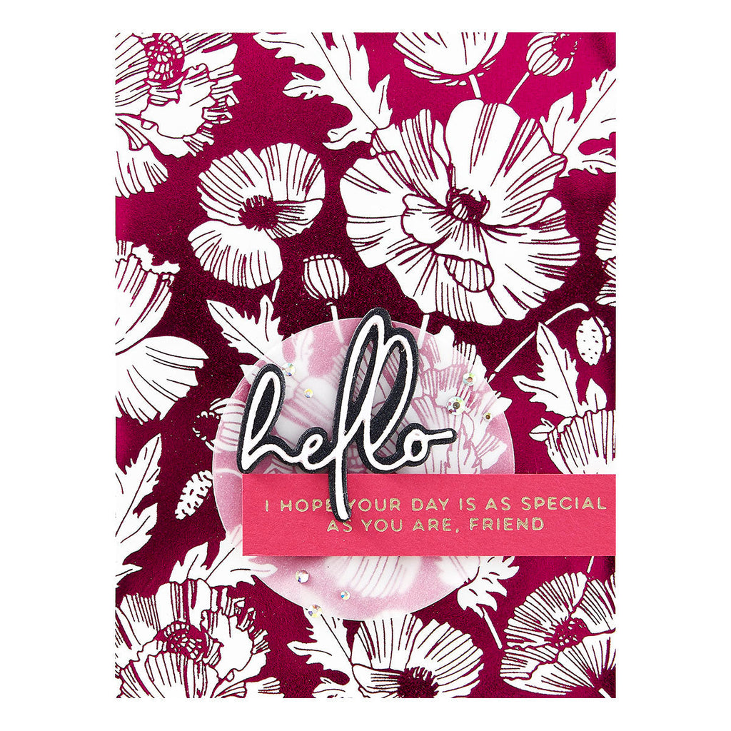 Poppy Background Press Plate is from the Yana's Poppies Collection by Yana Smakula. It creates a beautiful floral background for your card front. This plate can be hot foiled for a stunning effect. Works with STN-096 Layered Poppy Background Stencil (sold exclusively through BD-0885 Poppy Background Bundle.)