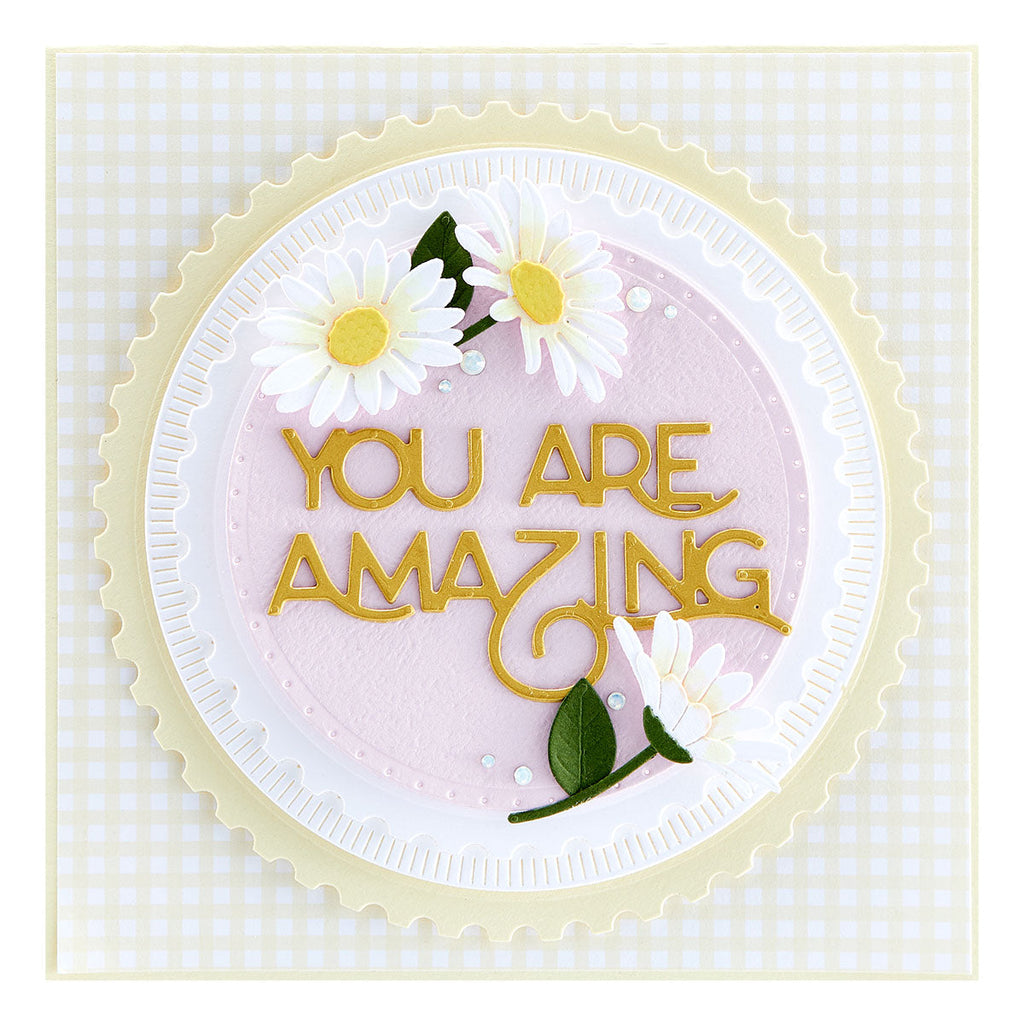 Postage Edge Circles Etched Dies are from the Postage Edge Shapes Collection by Becca Feeken and has eight thin metal cutting dies. For a subtle WoW factor, stack them with complementary circle shapes that has finishing edges like her Fluted Classics or Hemstitch Collection and others alike.