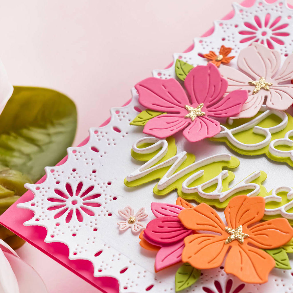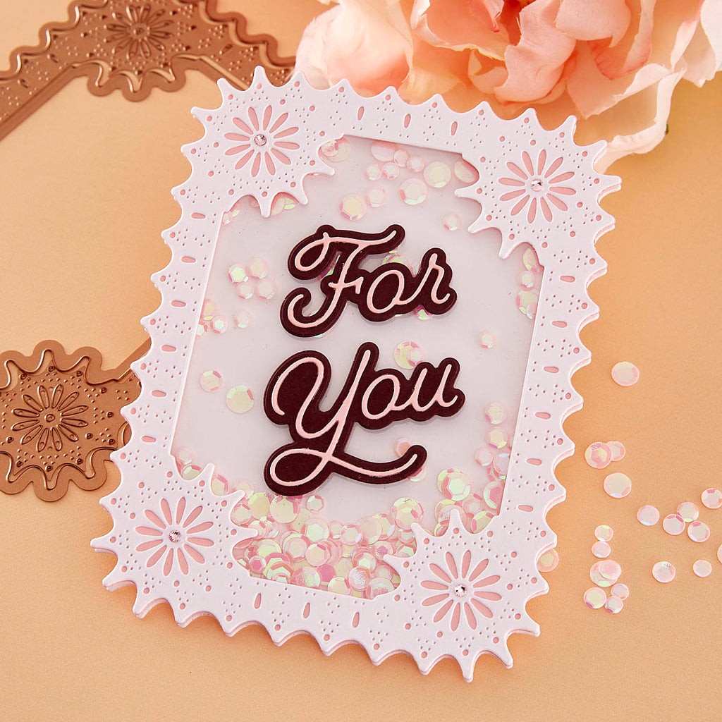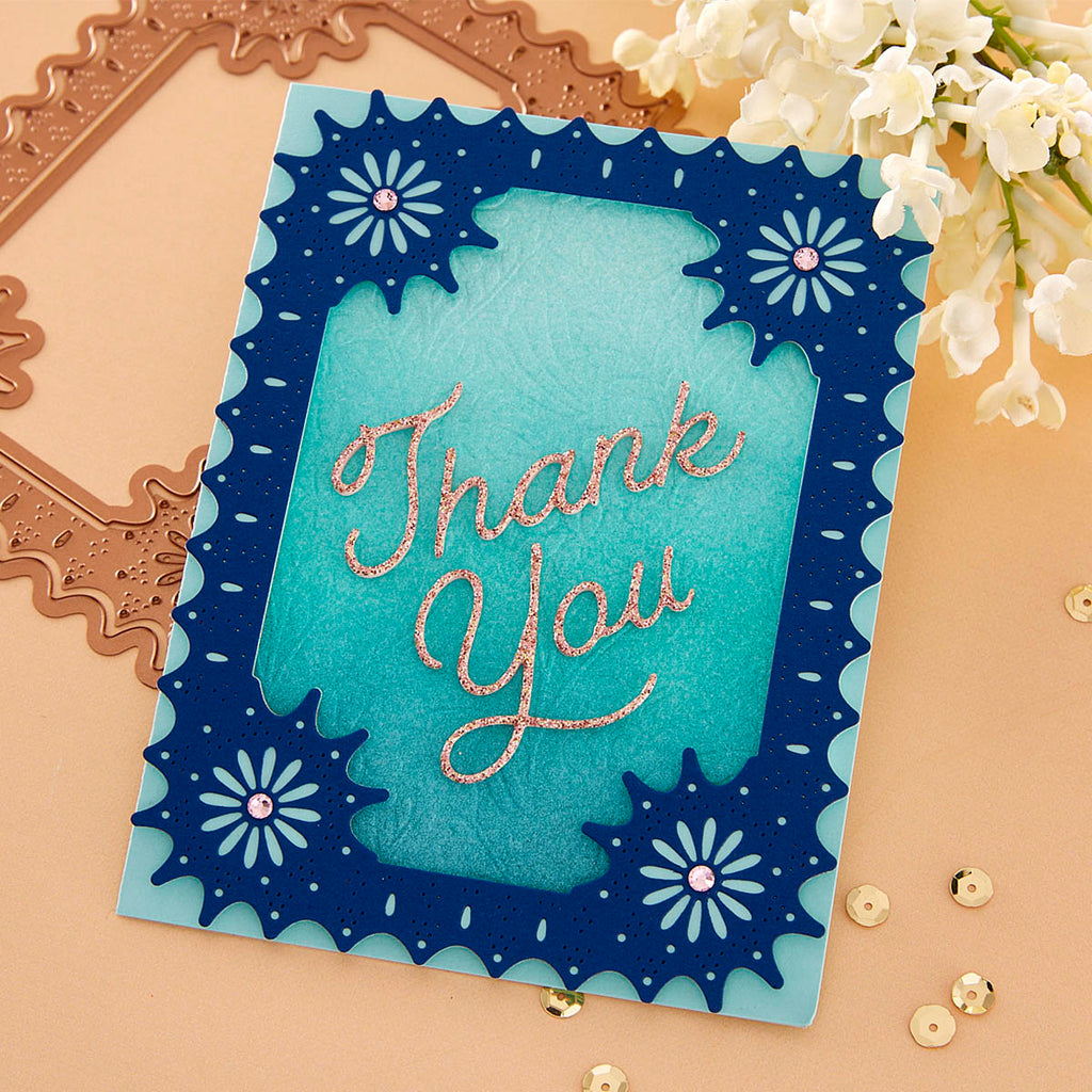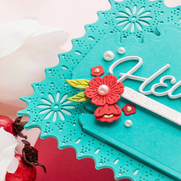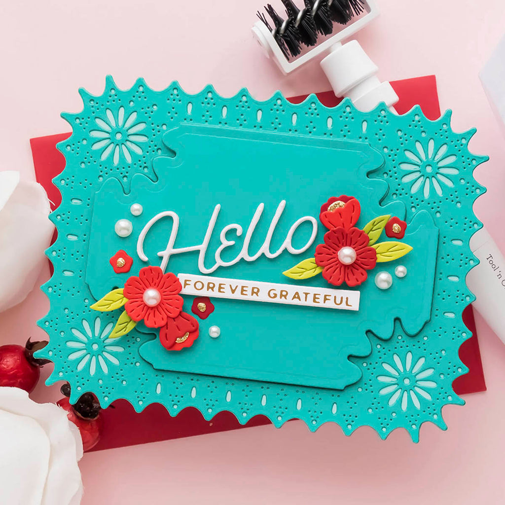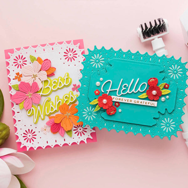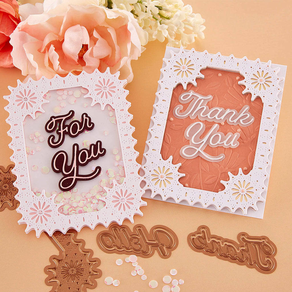 Punch & Pierce Frame and Sentiments - Large Die of the Month this 15-piece Die Set, cuts, embosses, debosses, and stencils. Released April 2023 to our Large Die of the Month Club creates a sweet blooming floral arrangement. Use to create cards, décor, gift card holder, gifts, and more!