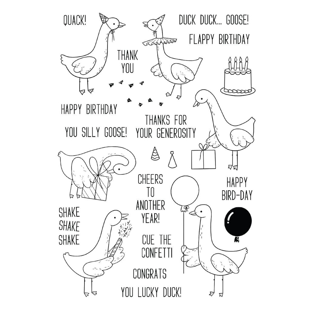Ranger Silly Goose Clear Stamp Set by Simon Hurley create has a set of twenty five fun stamps designed to bring a big of whimsy to birthday cards and layouts. These silly friends are ready to party! With six different geese and their celebratory accessories, plus a full array of sentiments for just the perfect message, this fun set is perfect for celebrating all your favorite people. Coordinates with S6-239 Silly Goose Etched Dies to perfectly cut out these cuties.