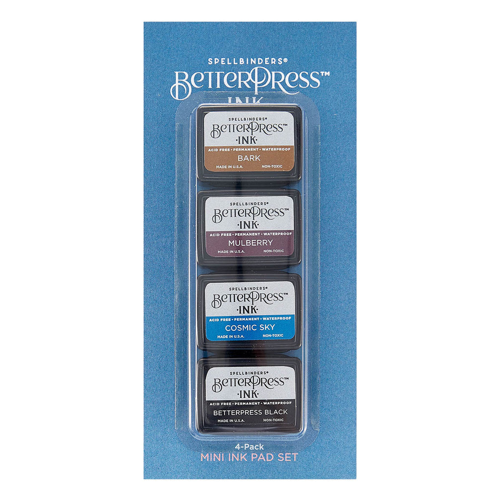 Regal Tones BetterPress Ink Mini Set includes four 1.25 x 1.75-inch ink pad colors of Bark, Mulberry, Cosmic Sky, and BetterPress Black. These inks are specially formulated Ranger Archival Ink made for the BetterPress Letterpress System. They are acid free, permanent, and waterproof. Follow the BetterPress Letterpress System instructions to create beautiful and detailed letterpress effects with these inks. Reink only with BetterPress Ink Reinkers (sold separately). Clean inked press plate with Ranger Archival Ink Cleaner.