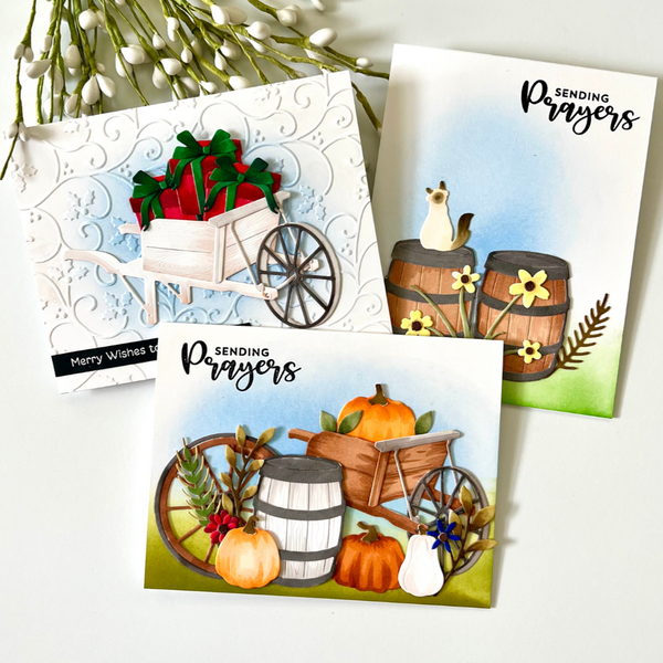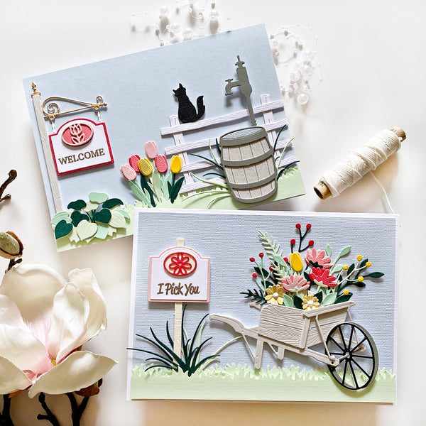 Rustic Garden Etched Dies are from the Country Road Collection by Annie Williams. A set of 16 thin metal cutting dies makes a quiet country scenery when put together. It has all the parts you need from a pump, a wagon wheel, a barrel, a birdhouse and you can even build a fence! Finishing touches can be found in S5-579 Seasonal Décor and S5-580 Garden Builder.