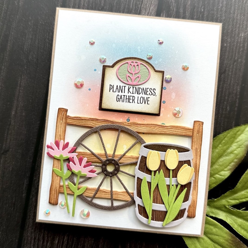 Country Road is Annie Williams’ debut collection with Spellbinders. This offering creates a wonderful rural backdrop. It includes all the details such as a wheelbarrow, florals, wooden signs to even fencing parts, and more. A clear stamp set provides not only a wonderful wood sign but sentiments and images to tie everything together. Bring a part of the countryside into your projects!