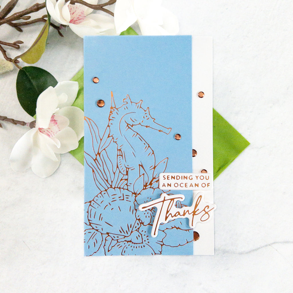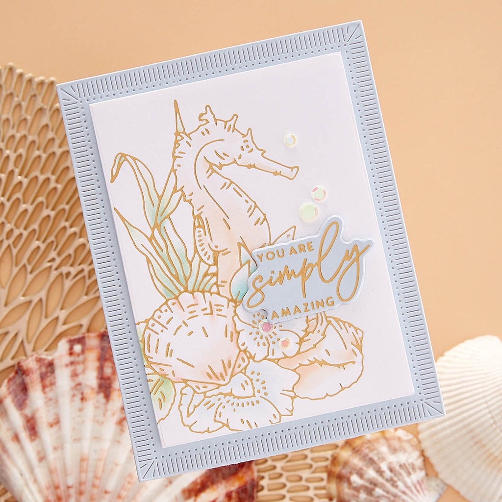Seahorse Kisses is a debut collection by designer Dawn Woleslagle with Spellbinders! This wonderful offering of hot foil plates, dies, stamps and even a 3D embossing folder encompasses around the beautiful seahorse. A symbol of strength, persistence, and peace, it is a stunning and unique collection to enhance your card creations and beyond!