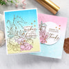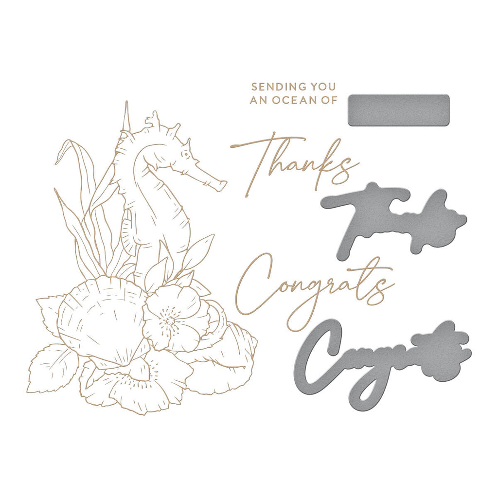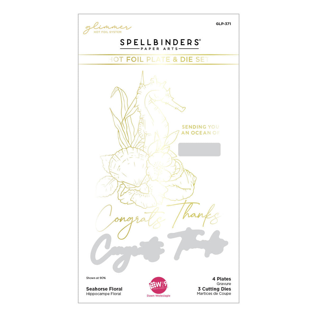 Seahorse Floral Glimmer Hot Foil Plate & Die Set is part of the Seahorse Kisses Collection by Dawn Woleslagle. The largest hot foil plate is a magnificent seahorse perched in a bed of floral and seashells. There are three sentiment plates, and all have coordinating thin metal cutting dies.