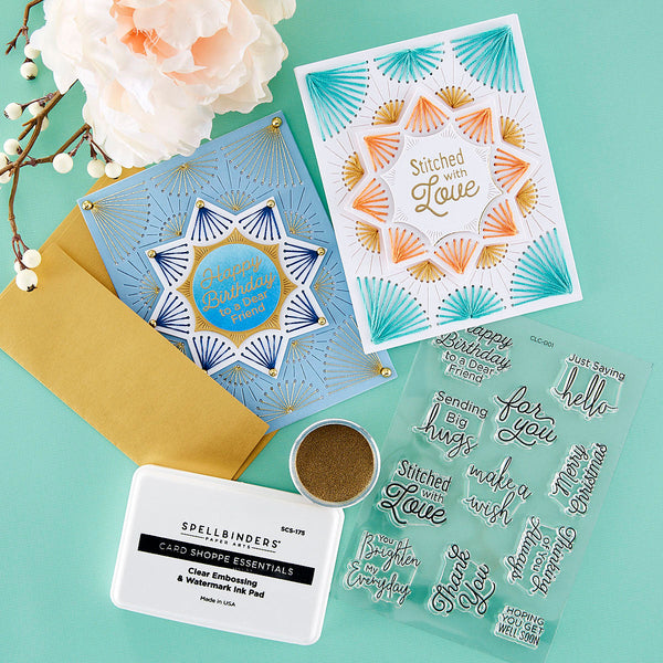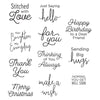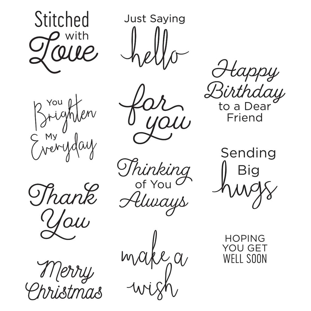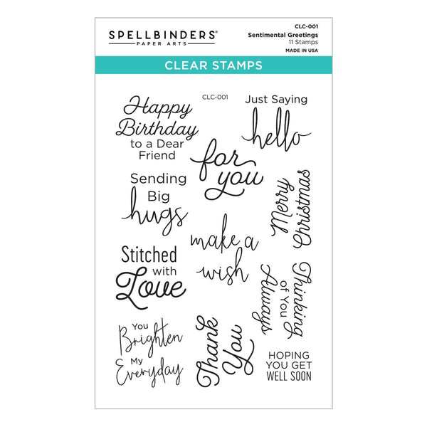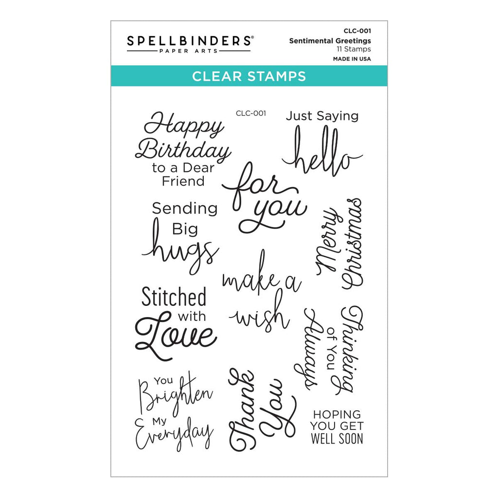 This 11-piece Sentimental Greetings Clear Stamp coordinates with the Nested Stitched Burst Stitching Die of the Month. Sentimental Greetings Clear Stamps includes seasonal and celebratory sentiments to use year round. The beautifully scripted phrases compliment crafts to create unique and fun looks for cards and crafts. This clear stamp set features high quality photopolymer for clear, crisp impressions. Made in the USA. Our stamps create one of the best impressions on the market giving you a perfect stamped image every time!