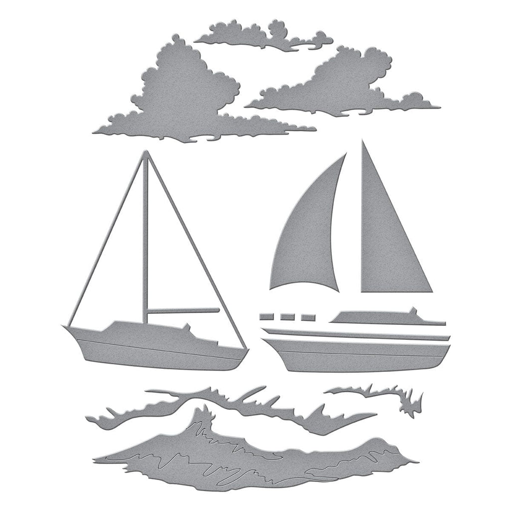 Set Sail Etched Dies are part of the Fair Winds Collection by Dawn Woleslagle. Create the perfect vessel for sailing off into the sunset with this set of eleven thin metal cutting dies. Assembled, this set creates a lovely sailboat navigating ocean waves beneath a cloudy sky. Full of realistic details and charming nautical elements, you’ll love customizing this boat before it sets sail. Combine with S4-1343 Guiding Light Etched Dies to create a full coastal scene of a lighthouse watching over stormy seas.