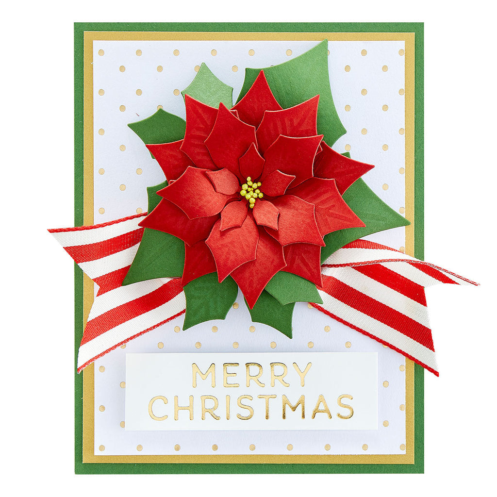 Build a holiday season flower arrangement with realistically embossed Layered Poinsettia leaves, bracts and flowers. Stack and layer the bracts and flowers for stunning and dimensional results. Create with foil, fabric and paper for mixed media, home decor, cards and more! Spellbinders® Shapeabilities® cut, emboss and stencil with a single die template.