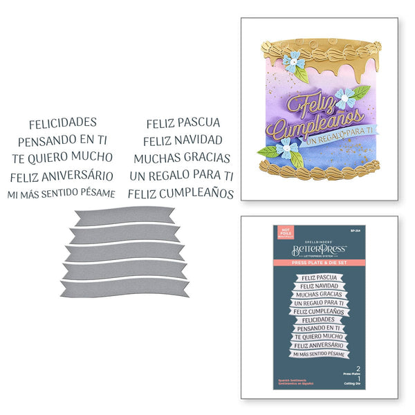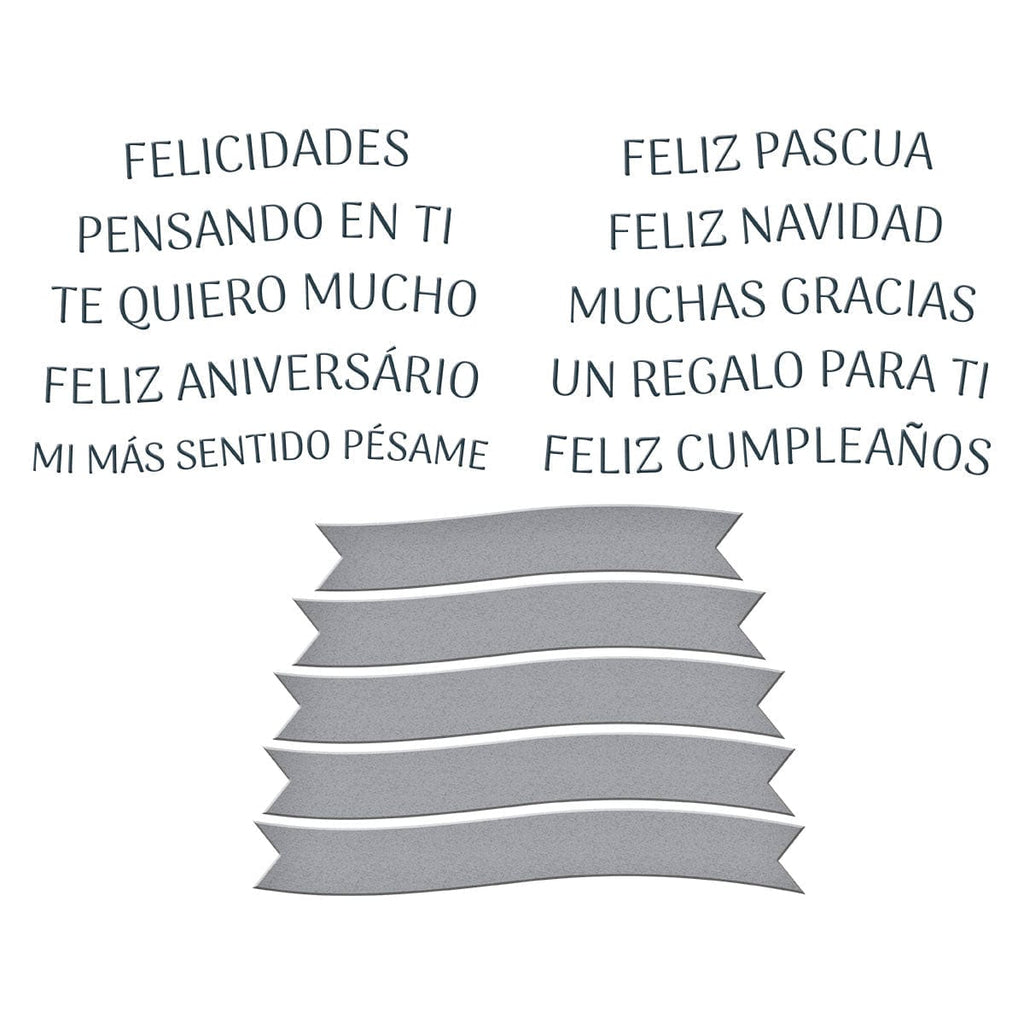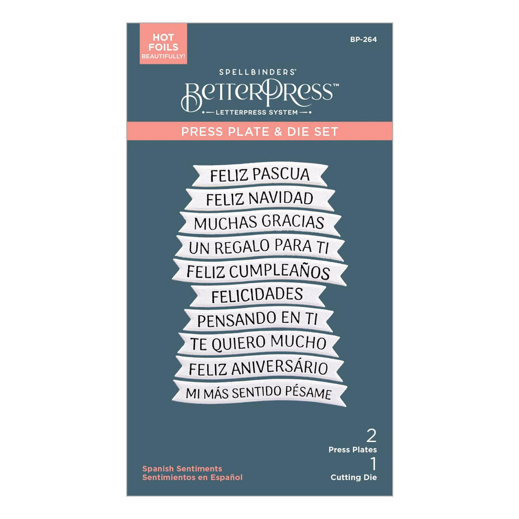 Spanish Sentiments BetterPress Plate & Die Set is from the International Sentiments Collection. Each of the two plates press five Spanish sentiments at once, perfect for cutting out with the matching thin metal cutting die for a time-saving step. The sentiment strips are cut into waving ribbon-tail ends on both sides to create movement. There’s a total of 10 sentiments to choose from. The uppercase font sentiments cover many occasions such as Pesame/Condolence, Feliz Navidad/Merry Christmas, Gracia/Funny, Regalo/Gift, Cumpleanos/Birthday, Felicidades/Congratulations, Pascua/Passover, Pensando/Thinking, Te Quiero/I love You and Aniversario/Anniversary. Ink the plates with the BetterPress Ink to be pressed against the BetterPress Cotton Card Panel and Sheets for a crisp letterpress design.