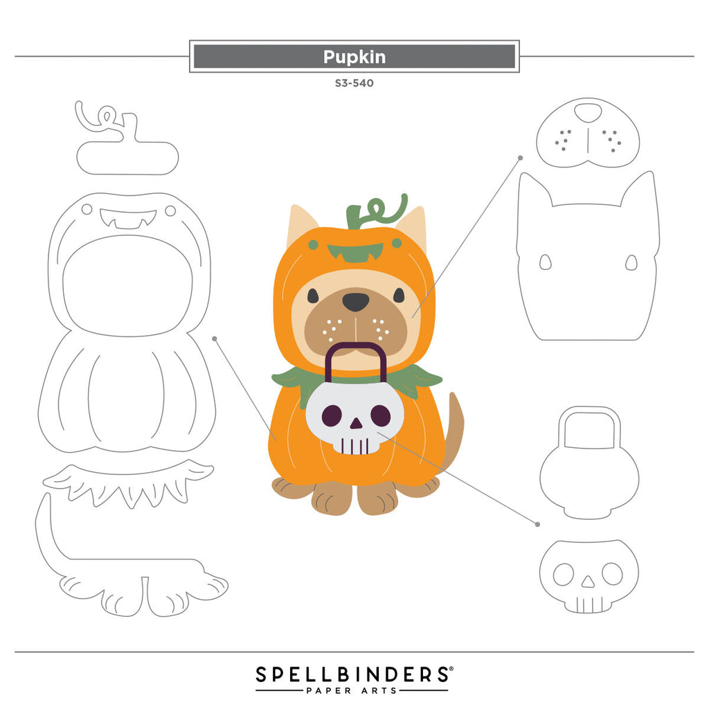 Pupkin Etched Dies Get ready for some howlin’ Halloween cuteness with the Pupkin Etched Dies! This delightful set includes eight thin metal dies that layer together to create an irresistibly sweet pup all dressed up in a pumpkin costume—skull treat bucket and all. Perfect for crafting charming cards, treat bags, and party invites with a playful autumn twist.