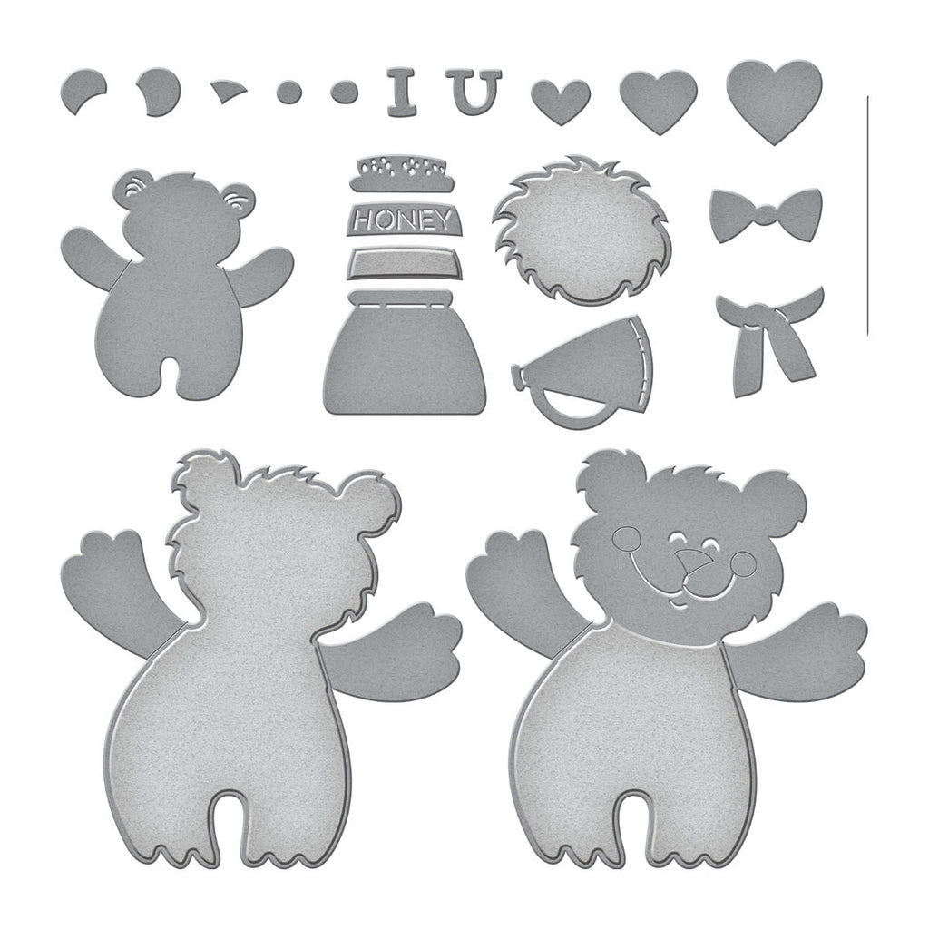 Stampendous Bear Hugs Etched Dies are part of the Stampendous Hugs Collection with a set of 16 thin metal cutting dies. Assembled it creates an adorable bear ready to give hugs and brighten someone’s day! It can literally give hugs as the arms and legs are scored to fold. There are several accessories included such as honey pot, megaphone, hearts, ribbons and even a smaller teddy bear to hug! It is designed to work with STP-200 Bear Hugs and Sentiments Clear Stamp Set with various facial expressions and wonderful sentiments to warm the heart!