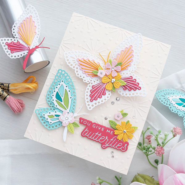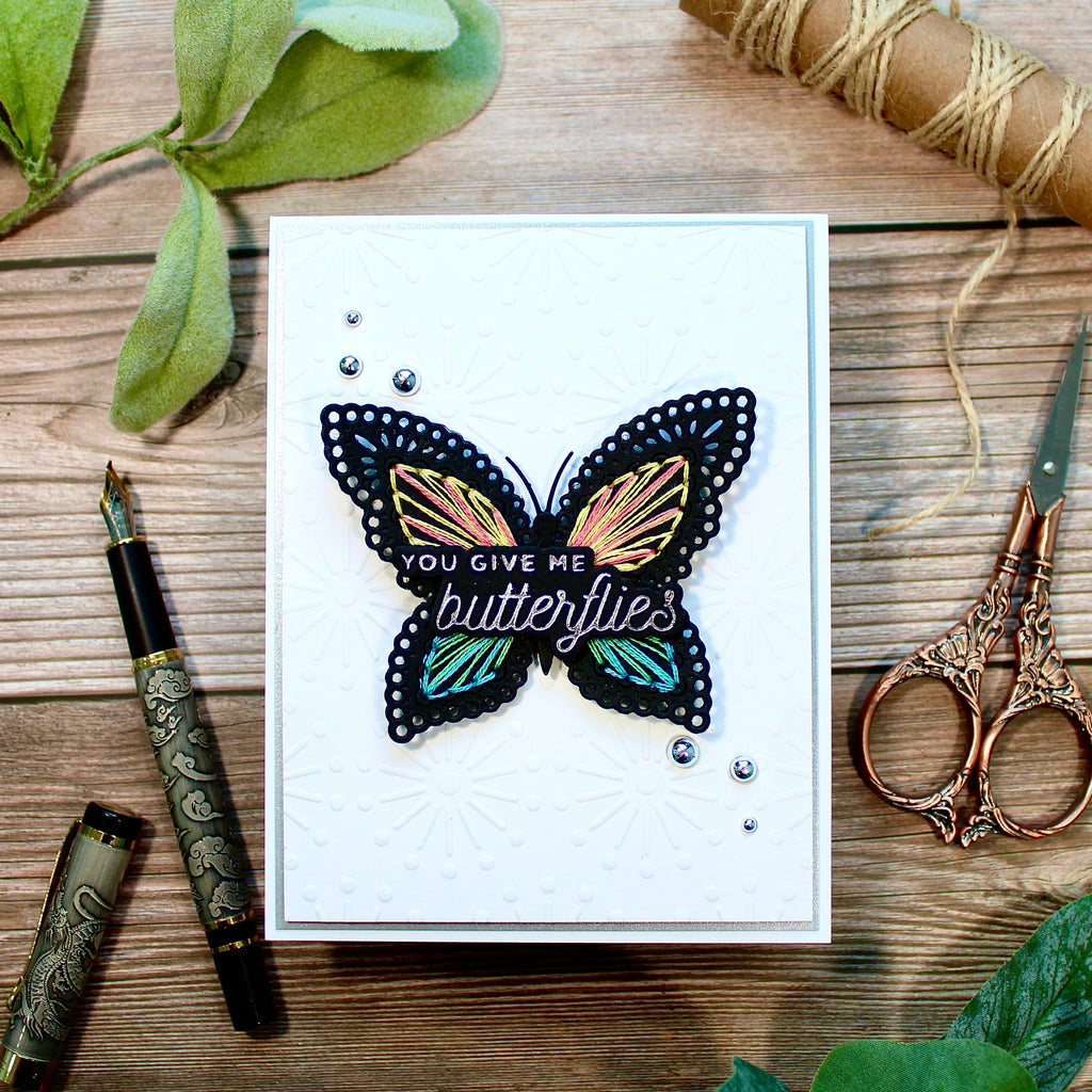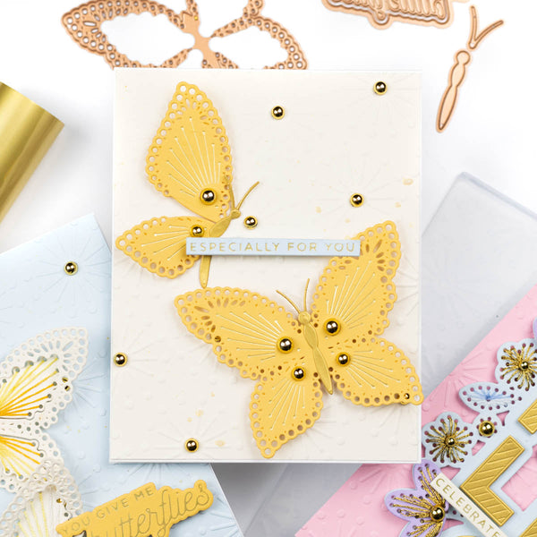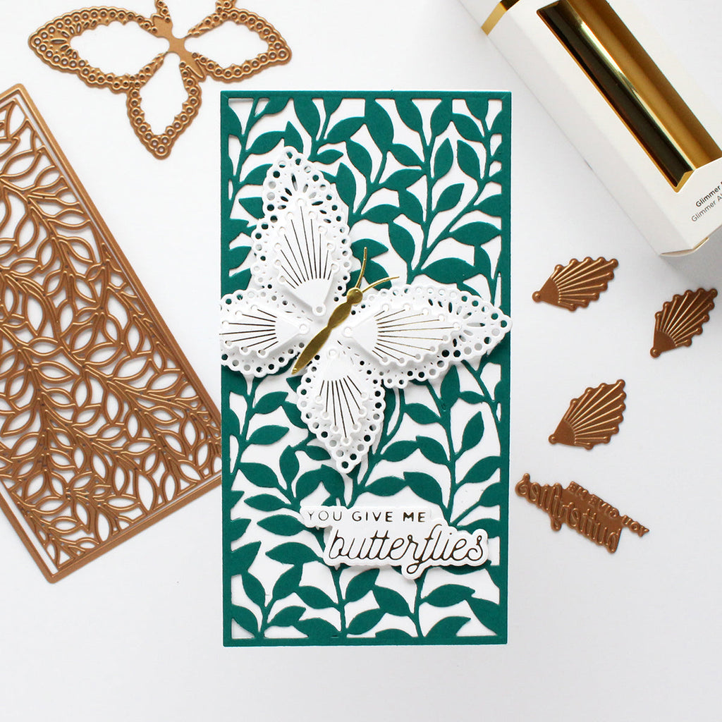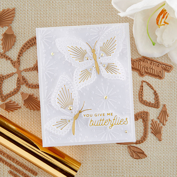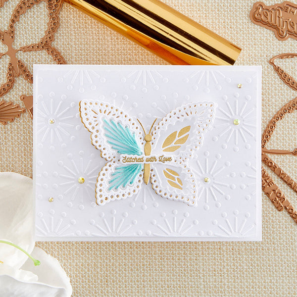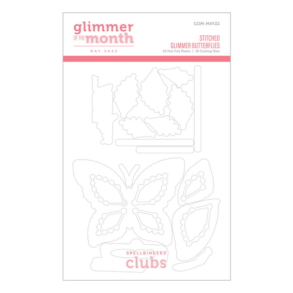 Stitched Glimmer Butterflies - Glimmer Hot Foil Kit of the Month (Plates Only). This Glimmer Hot Foil Plate Set adds stunning foiled butterflies to cards and projects. Released May 2022 to our Glimmer Hot Foil Kit of the Month Club, it is a wonderful addition to your glimmer collection. Perfect for creating spring, summer greeting cards, décor, gifts, and more! Glimmer Hot Foil Plates are designed to be used with the Spellbinders Glimmer Hot Foil System (or other compatible hot foil system). Depending on its design, some plates may be used for letterpress and embossing.