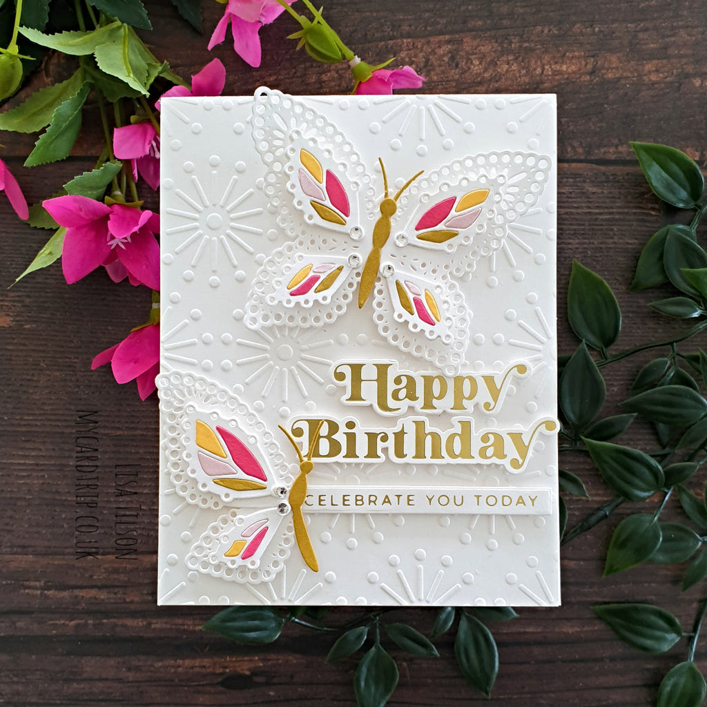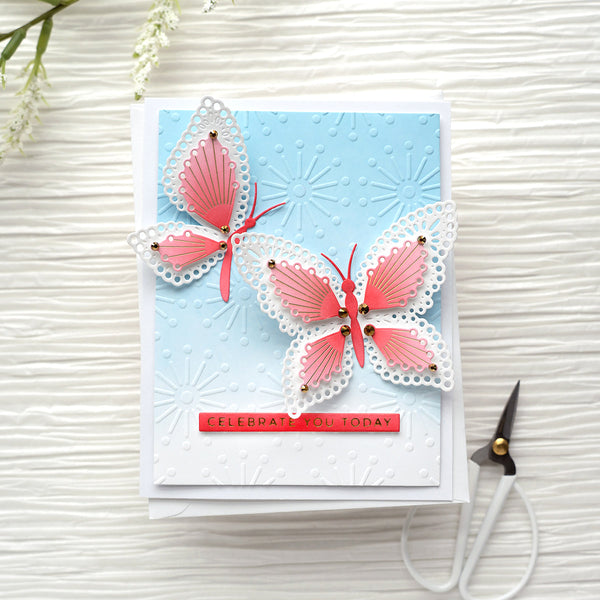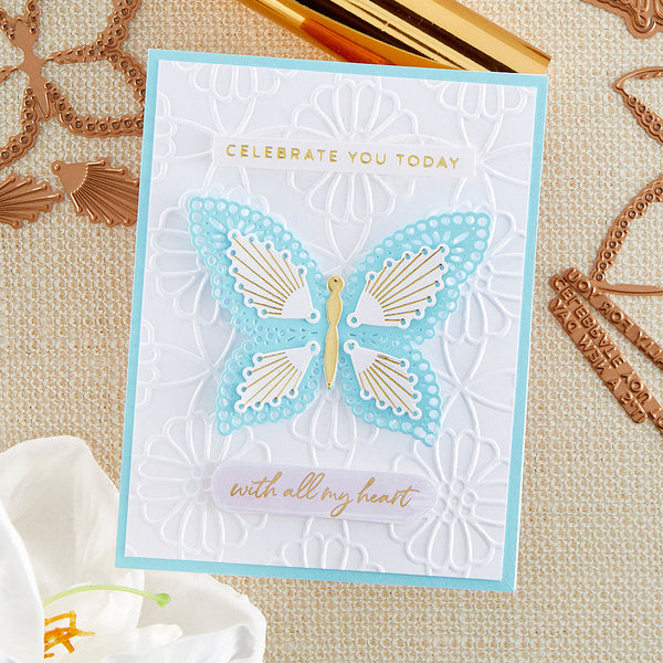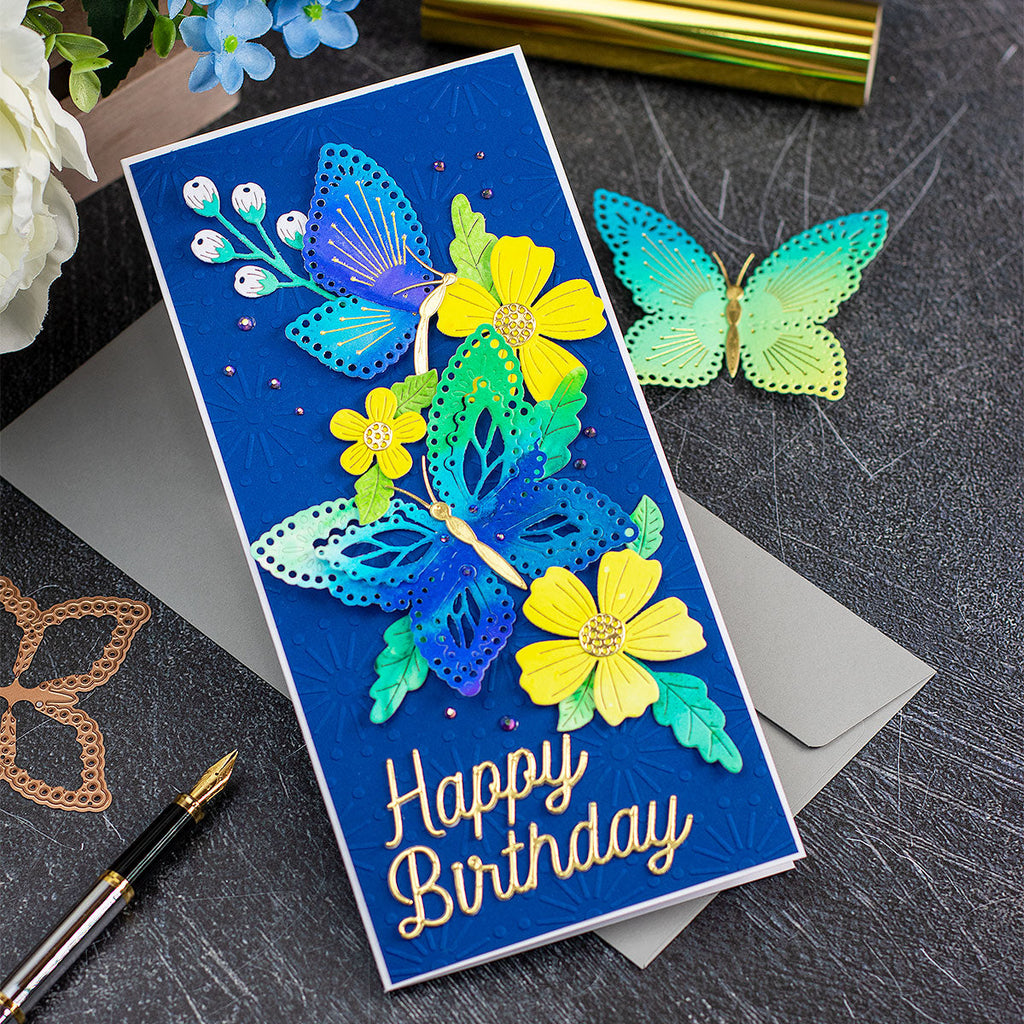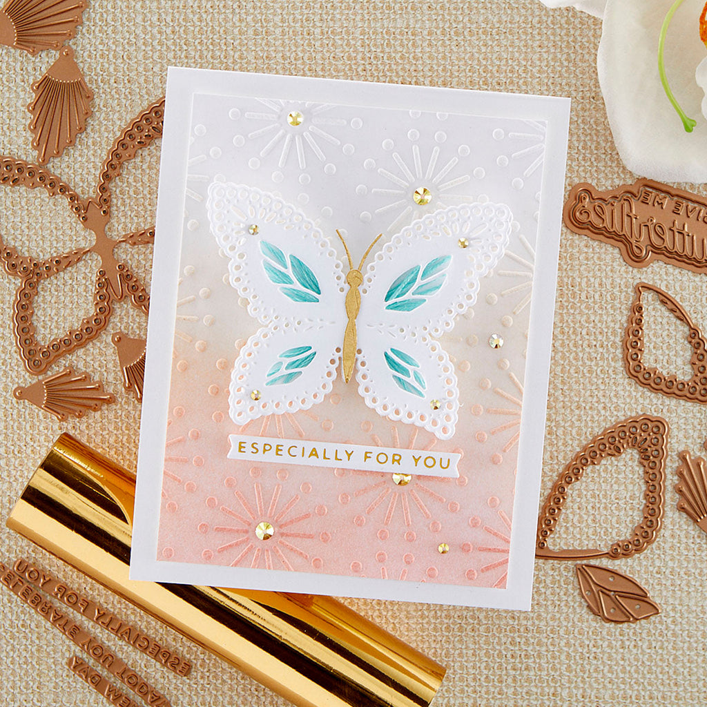 Stitched Glimmer Butterflies - Glimmer Hot Foil Kit of the Month (Plates Only). This Glimmer Hot Foil Plate Set adds stunning foiled butterflies to cards and projects. Released May 2022 to our Glimmer Hot Foil Kit of the Month Club, it is a wonderful addition to your glimmer collection. Perfect for creating spring, summer greeting cards, décor, gifts, and more! Glimmer Hot Foil Plates are designed to be used with the Spellbinders Glimmer Hot Foil System (or other compatible hot foil system). Depending on its design, some plates may be used for letterpress and embossing.