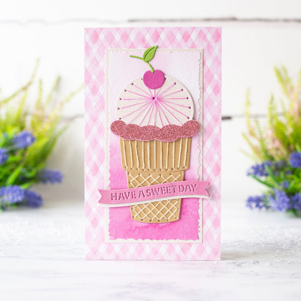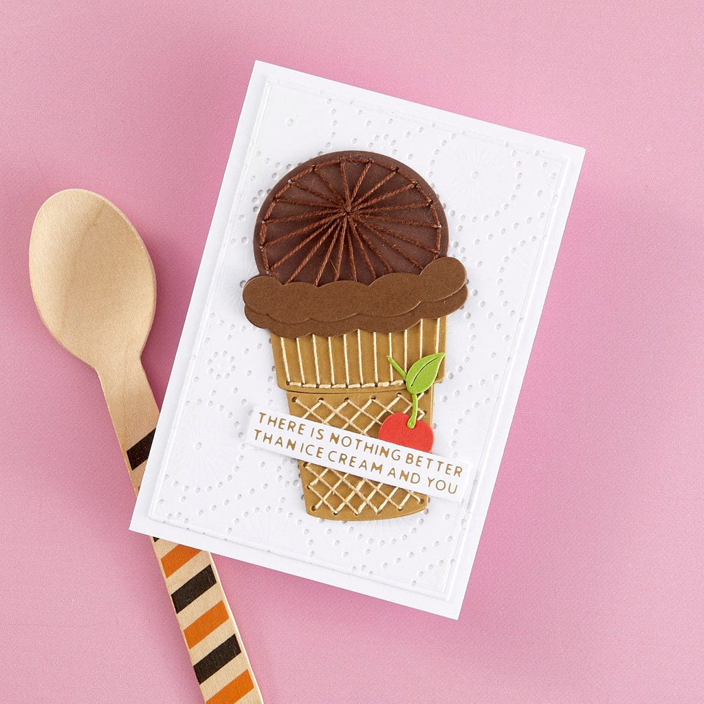 Stitched Ice Cream - Stitching Die of the Month Die this 12-piece die set released June 2024 to our Stitching Die of the Month Club creates a cute stitched ice cream cone. Use to create cards, décor, gift card holder, gifts, and more! Add stitching to have even more textures in crafts.