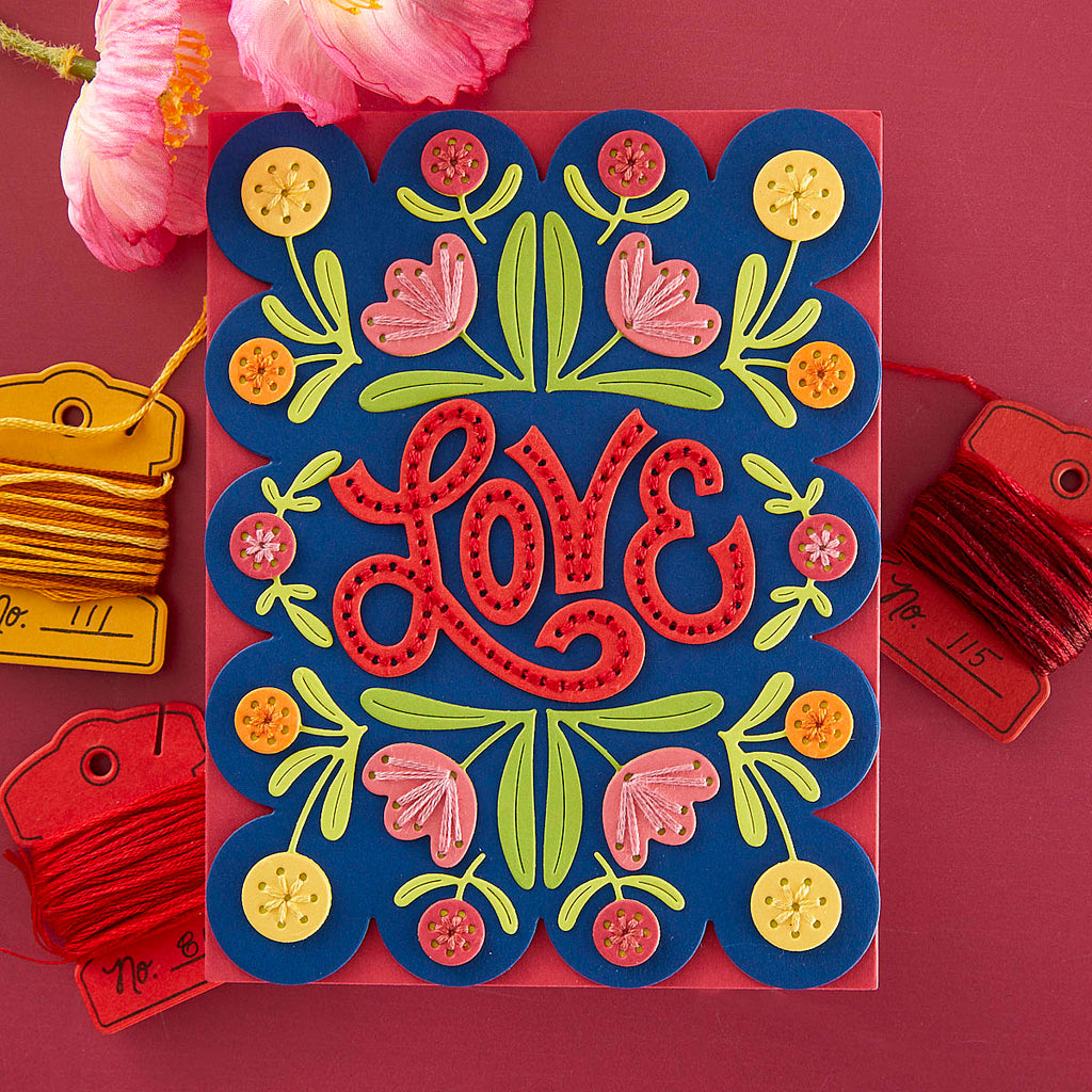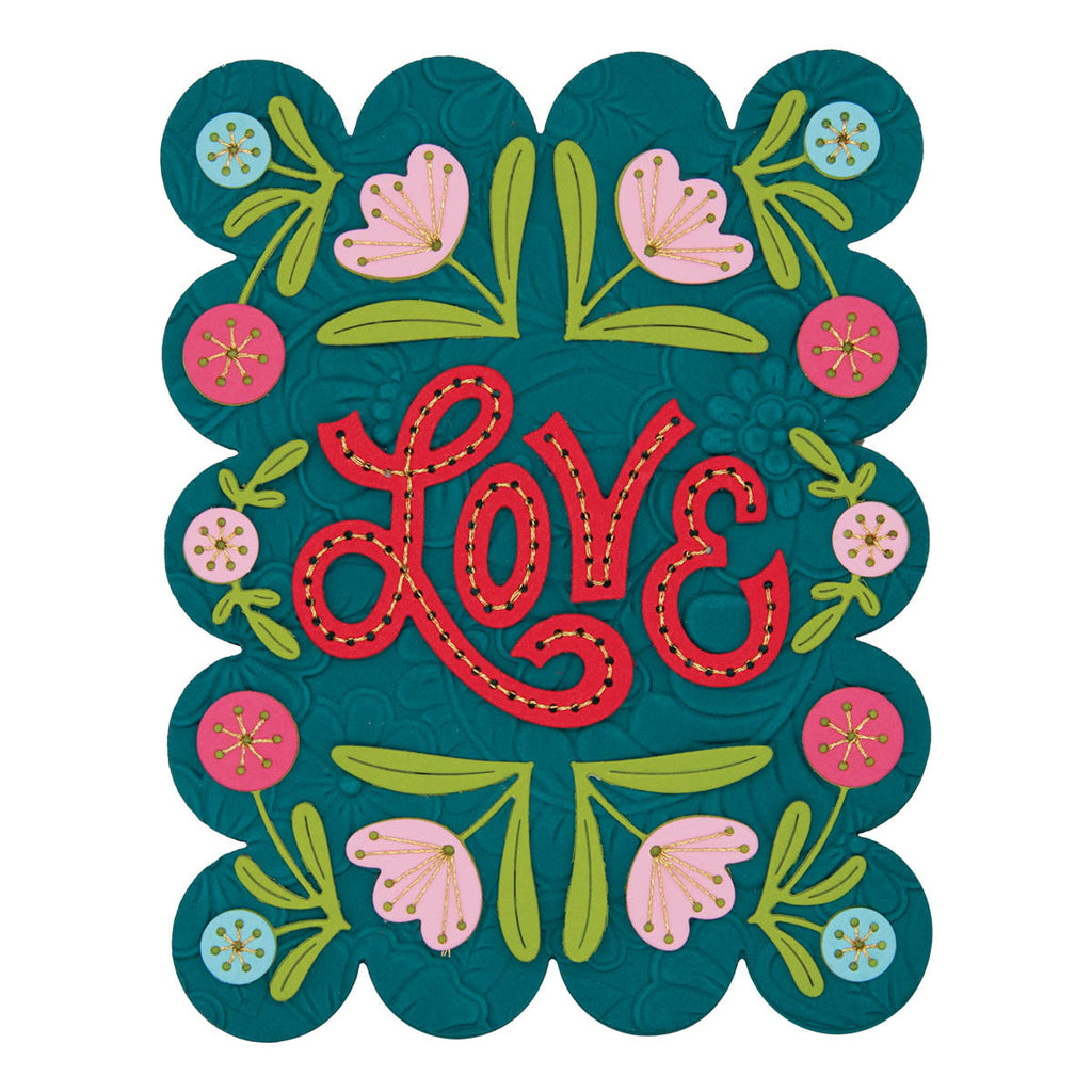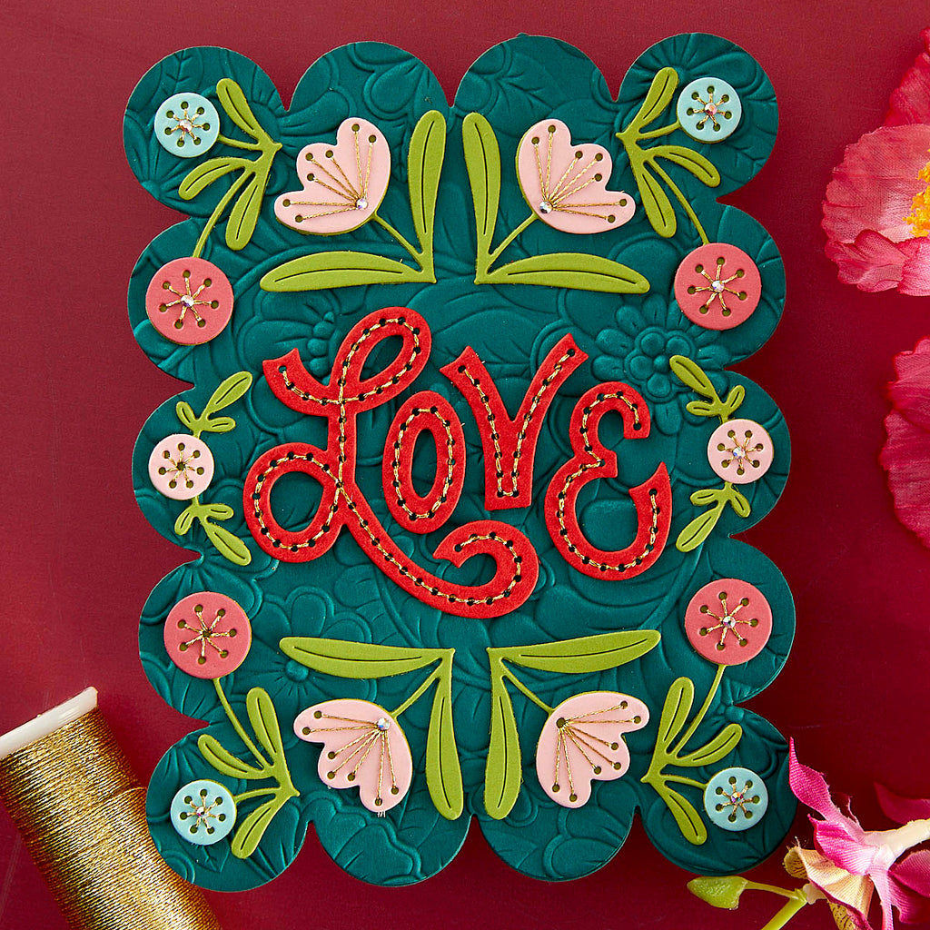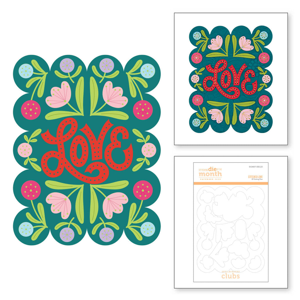 Stitched Love- Stitching Die of the Month Die this 13-piece die set released December 2023 to our Stitching Die of the Month Club creates a cardfront full of love. Use to create cards, décor, gift card holder, gifts, and more! Add stitching to have even more textures in crafts.