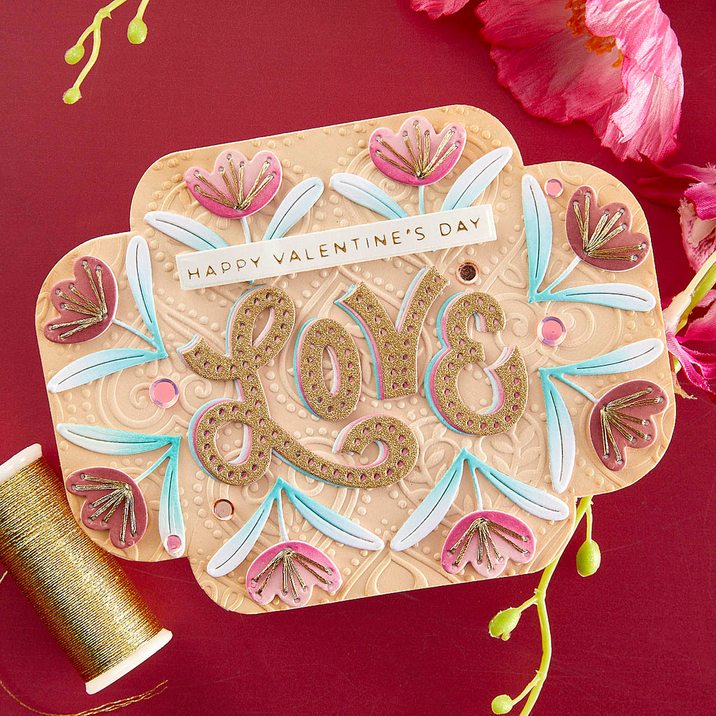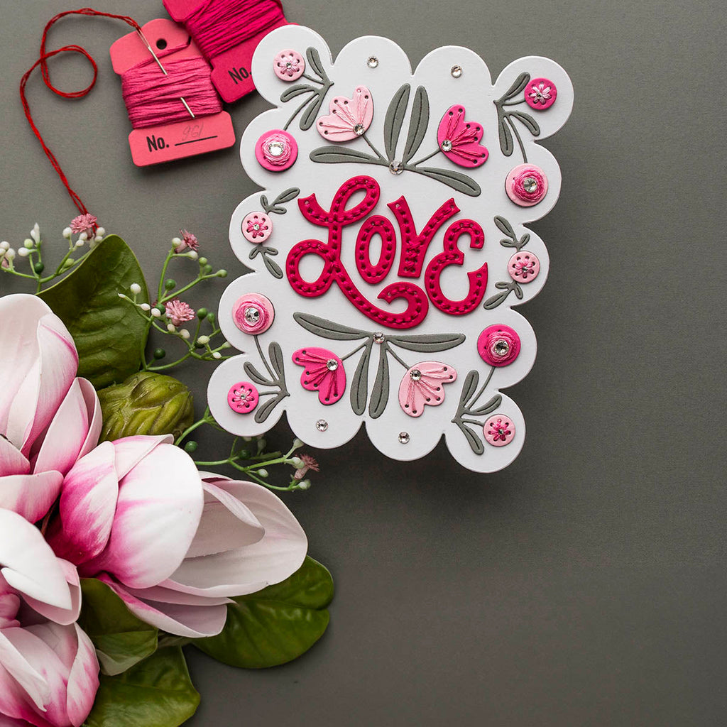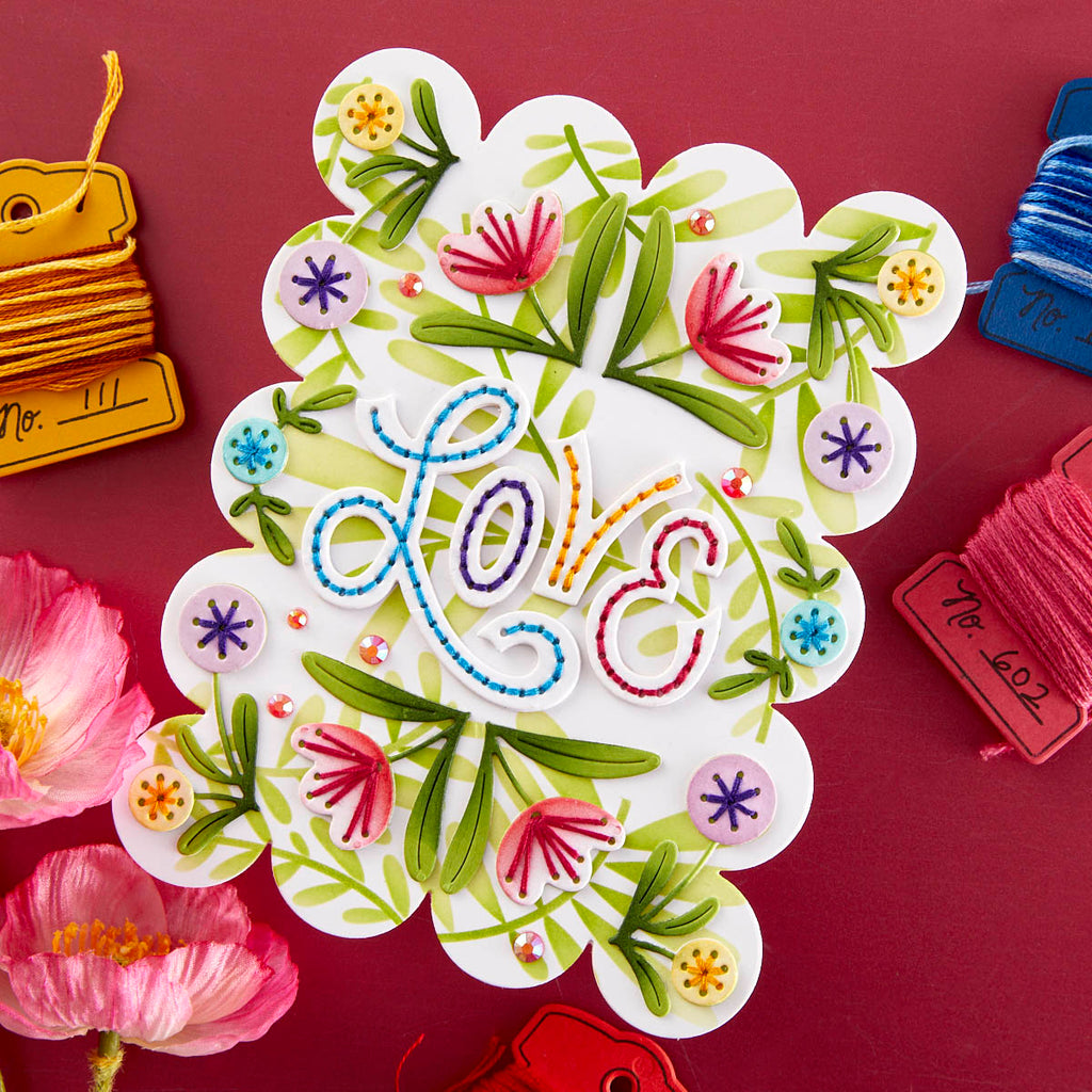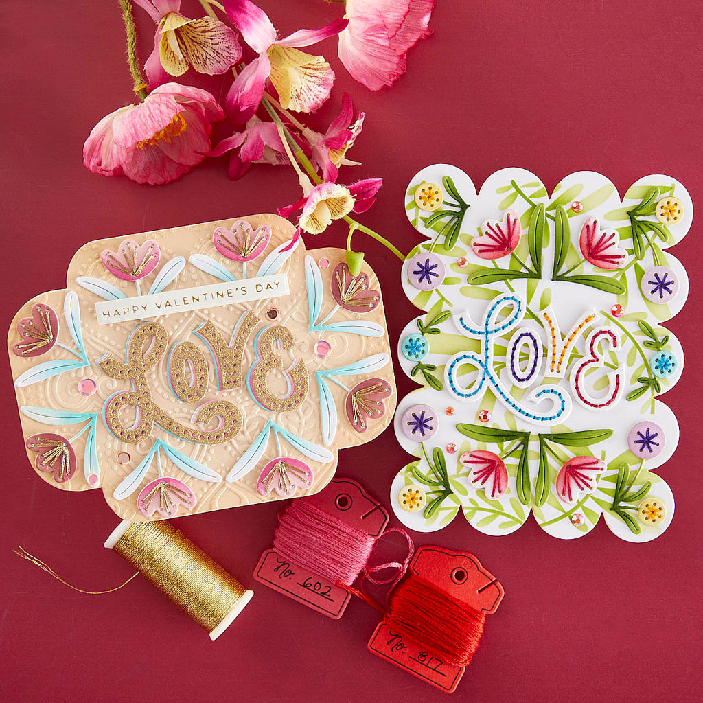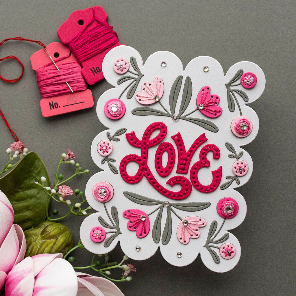 Stitched Love- Stitching Die of the Month Die this 13-piece die set released December 2023 to our Stitching Die of the Month Club creates a cardfront full of love. Use to create cards, décor, gift card holder, gifts, and more! Add stitching to have even more textures in crafts.