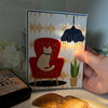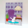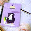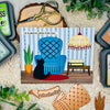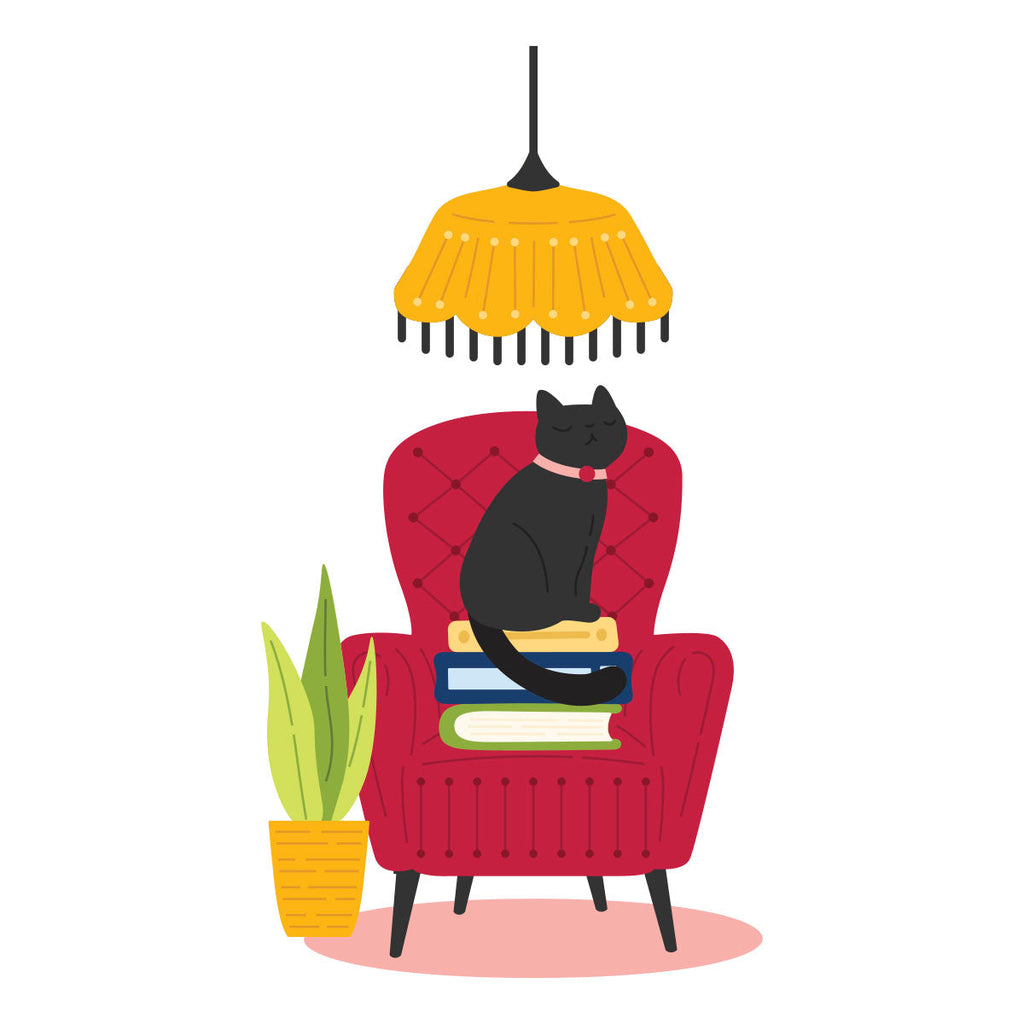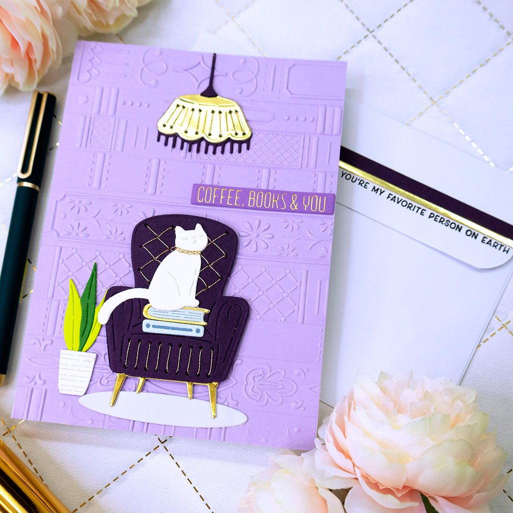 Add a snoozing kitty for extra personality, and use embroidery floss or thread to highlight textures in the chair and lamp. This set is perfect for heartfelt cards, book-themed projects, and homey handmade décor.