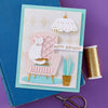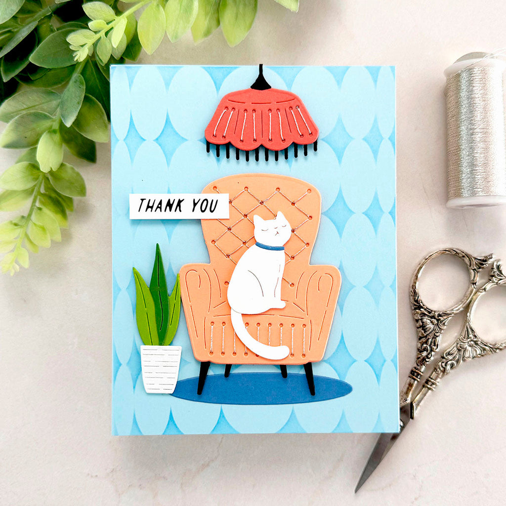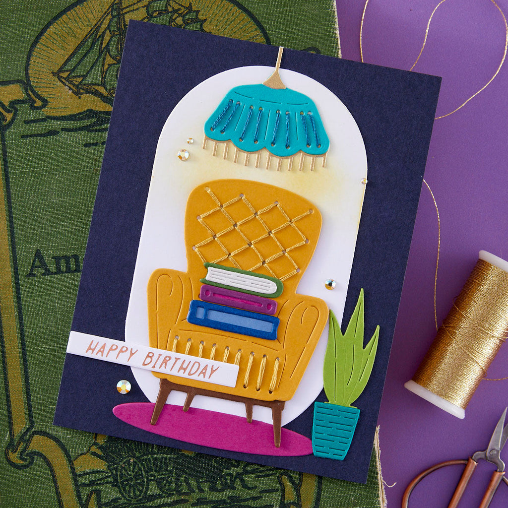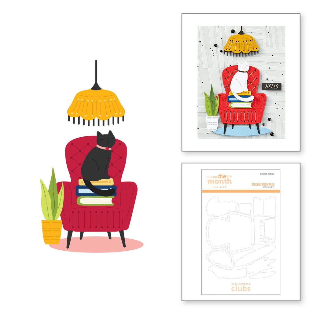 Stitched Study Nook May 2025 Stitching Die of the Month: Create cozy charm with the “Stitched Study Nook” Stitching Die of the Month! This inviting scene features a tufted armchair, stack of books, leafy plant, and a stylish hanging lamp — all enhanced with delicate stitching details that bring depth and warmth.