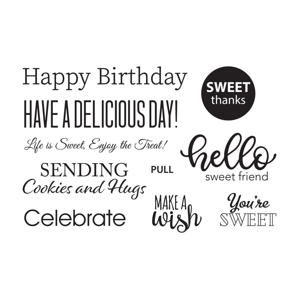 Sugar Coated Sentiments Clear Stamp Set is part of the Sweet Street Collection by Tina Smith. There are 10 clear Photopolymer stamps in the set and designed to work with an acrylic block. The stamps are made in the U.S.A. Sentiments include Happy Birthday, Have a Delicious Day, Life is Sweet Enjoy the Treat, Sending Cookies and Hugs, Sweet Thanks, Hello Sweet Friend, Celebrate, Pull, Make a Wish and You're Sweet.