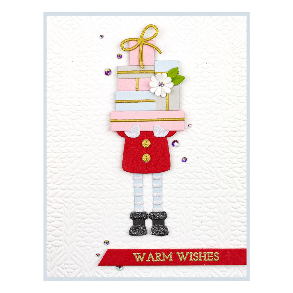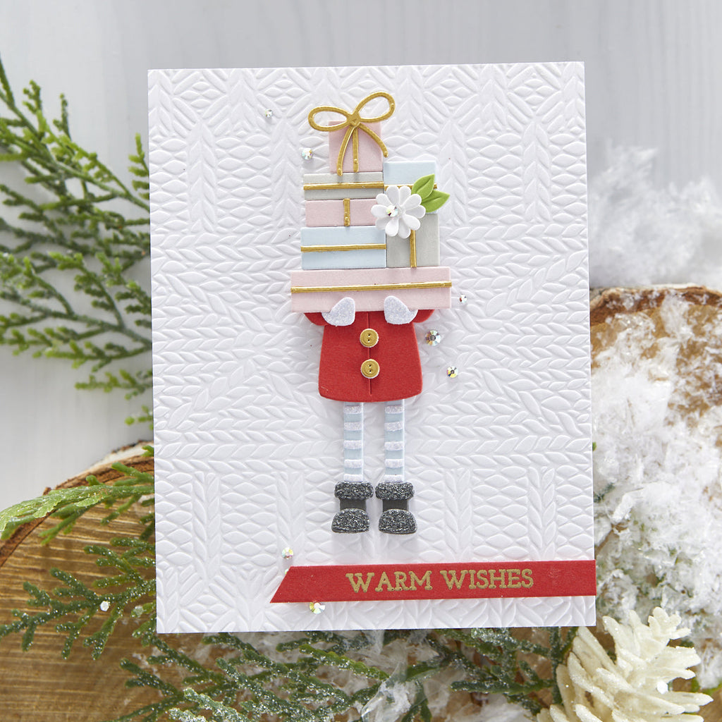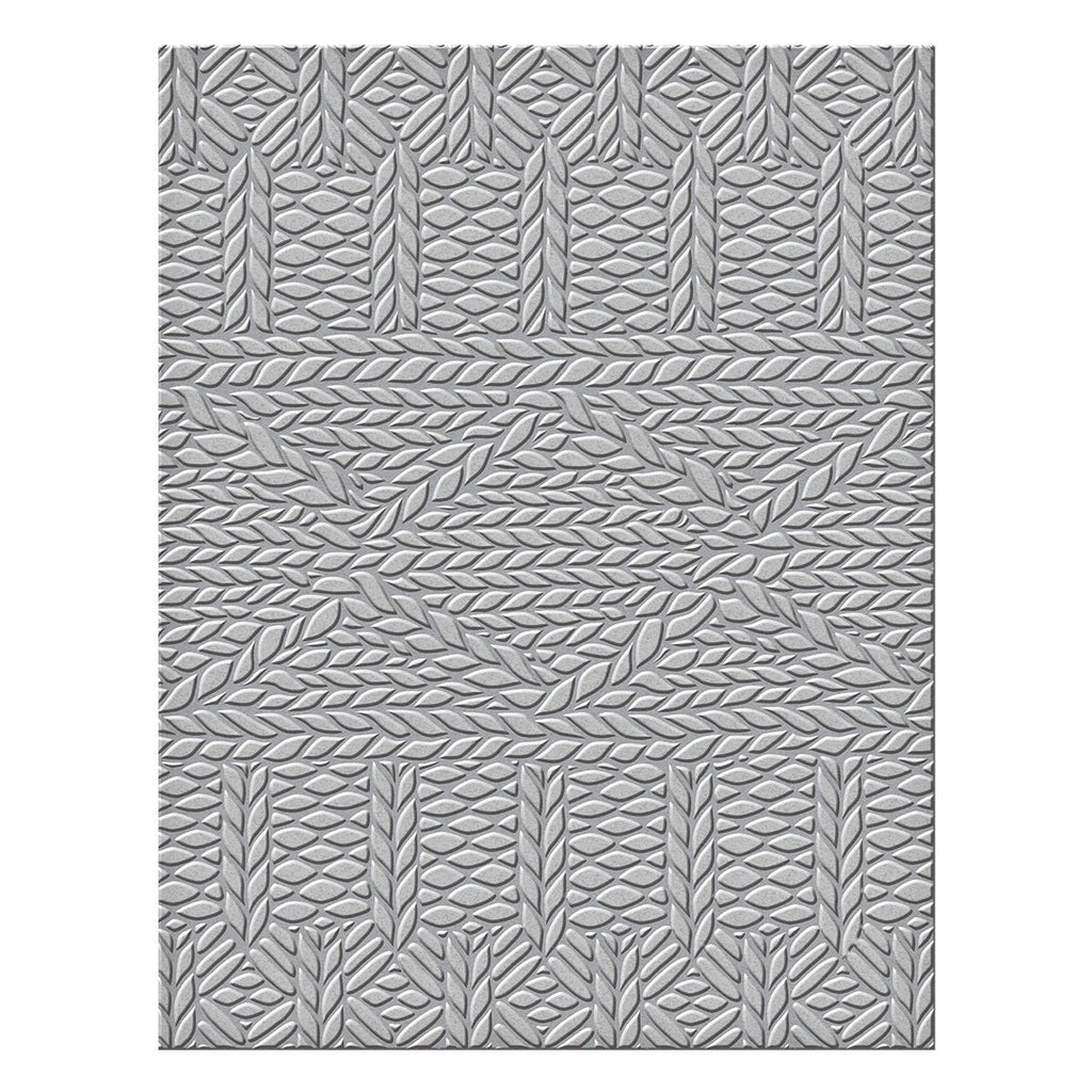 The Sweater Weather Embossing Folder is from the Be Merry Collection. It embosses a fabulously detailed knit pattern that fits an A2-sized (4.25 x 5.5-inch) card front. Add wonderful texture and dimension to your surface. Apply ink on one side of the folder for a letter press effect. Ink the raised embossed area to highlight.