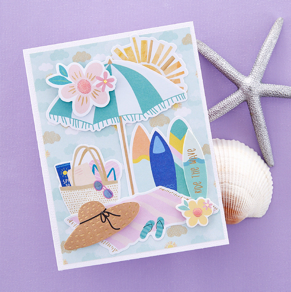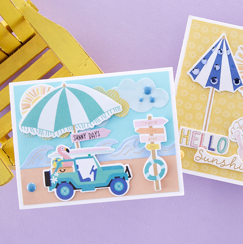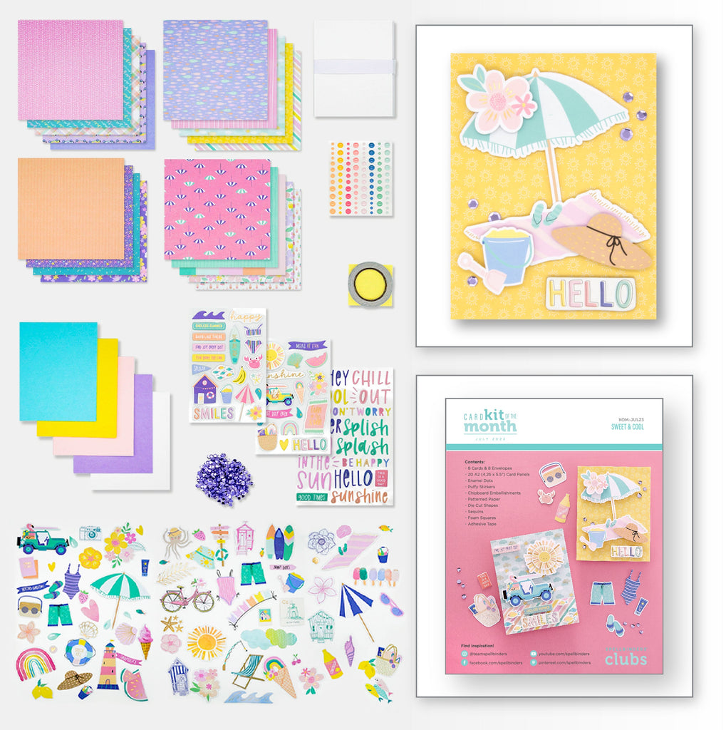 Sweet & Cool 2023 July Cardmaking Kit is a must have! Show others how much they mean to you with this kit featuring beachy and summer themed embellishments and sentiments. This cardmaking kit is perfect for anyone who loves to craft, die cut, and make beautiful handmade cards. Stay Sweet & Cool with enough items to create 8 full cards.