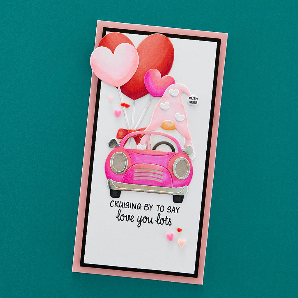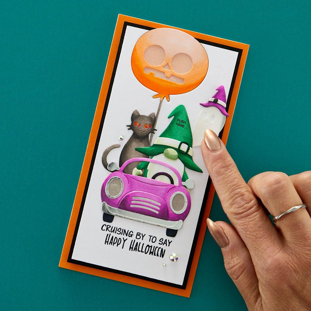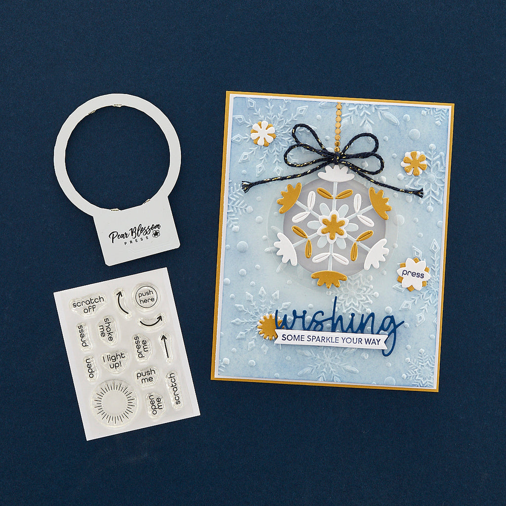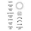 Take Action Sentiments Clear Stamp Set is a set of 14 stamps designed to be used with interactive card elements. With stamps for "Push me," "Shake Me," "Open Me" and "Scratch Me," you'll be able to easily gift playful cards and projects with easy instructions. Also included are arrows and circles to let your recipients know where to press for lights and more.