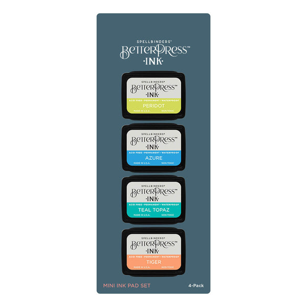 Tropical BetterPress Ink Mini Set includes four 1.25 x 1.75-inch ink pads in the colors of Peridot, Tiger, Teal Topaz, and Azure for a gorgeous set that conjures sunny days and ocean vistas. These inks are specially formulated Ranger Archival Ink made for the BetterPress Letterpress System. They are acid free, permanent, and waterproof. Follow the BetterPress Letterpress System instructions to create beautiful and detailed letterpress effects with these inks. Reink only with BetterPress Ink Reinkers (sold separately). Clean inked press plate with Ranger Archival Ink Cleaner.