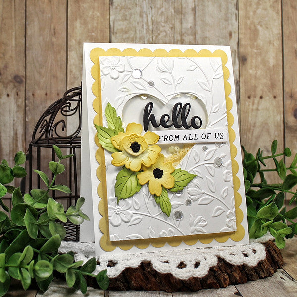 Vintage Florals Etched Dies is part of the From the Garden Collection by Wendy Vecchi with a set of 16 thin metal cutting dies. Assembled the set, it creates a wonderful assortment of blooms such a large flower accent, stemmed florals, buds, and blossoms. Also included is a hello sentiment with its outline in a lower-case script font.