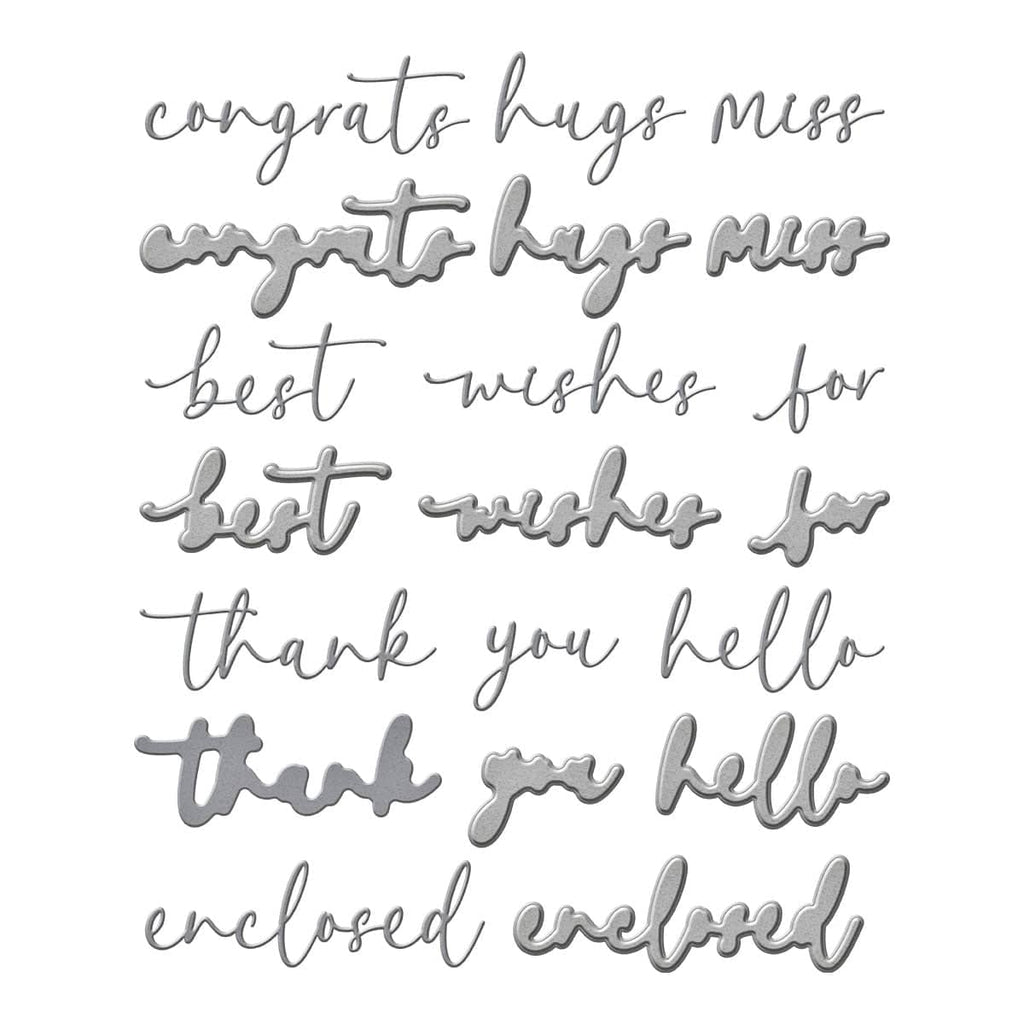 Vivid Script Sentiments Etched Dies are from the Vivid Expressions Collection. Express congratulatory sentiments with this set of 20 thin metal cutting dies! The lowercase script words and its outline design include best, wishes, hugs, enclosed and congrats. Personalize many greetings from these word options!