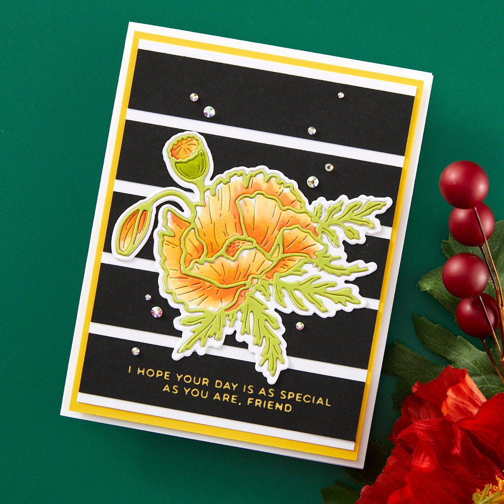 Yana’s Poppy Etched Dies are part of the Yana's Poppies Collection by Yana Smakula. It has a set of two thin metal cutting dies to create an intricately designed poppy flower in full bloom with two buds and leaf accents along the edges. Yana’s Poppies Collection by Yana Smakula is a lovely offering of poppy designs through dies, stencils and press plates. It is a wonderful addition for paper crafters who love this floral motif!